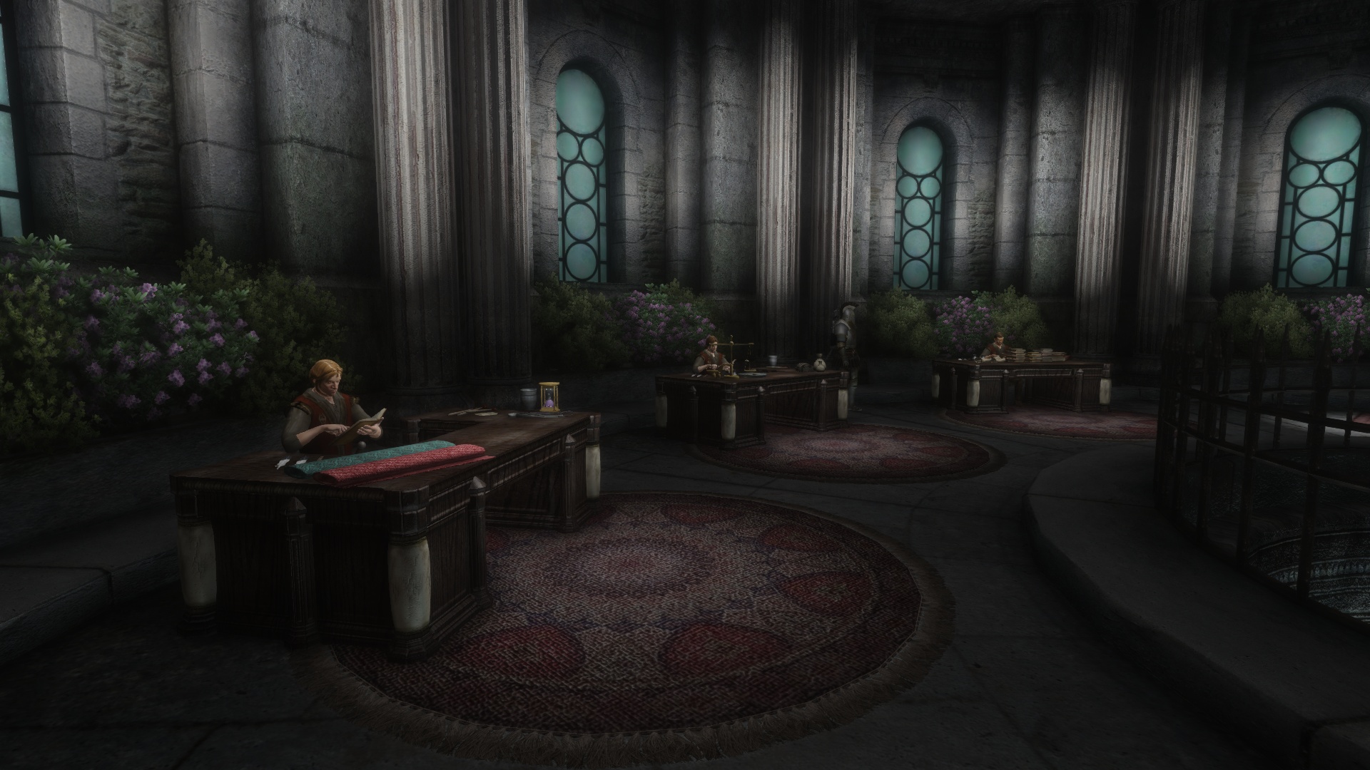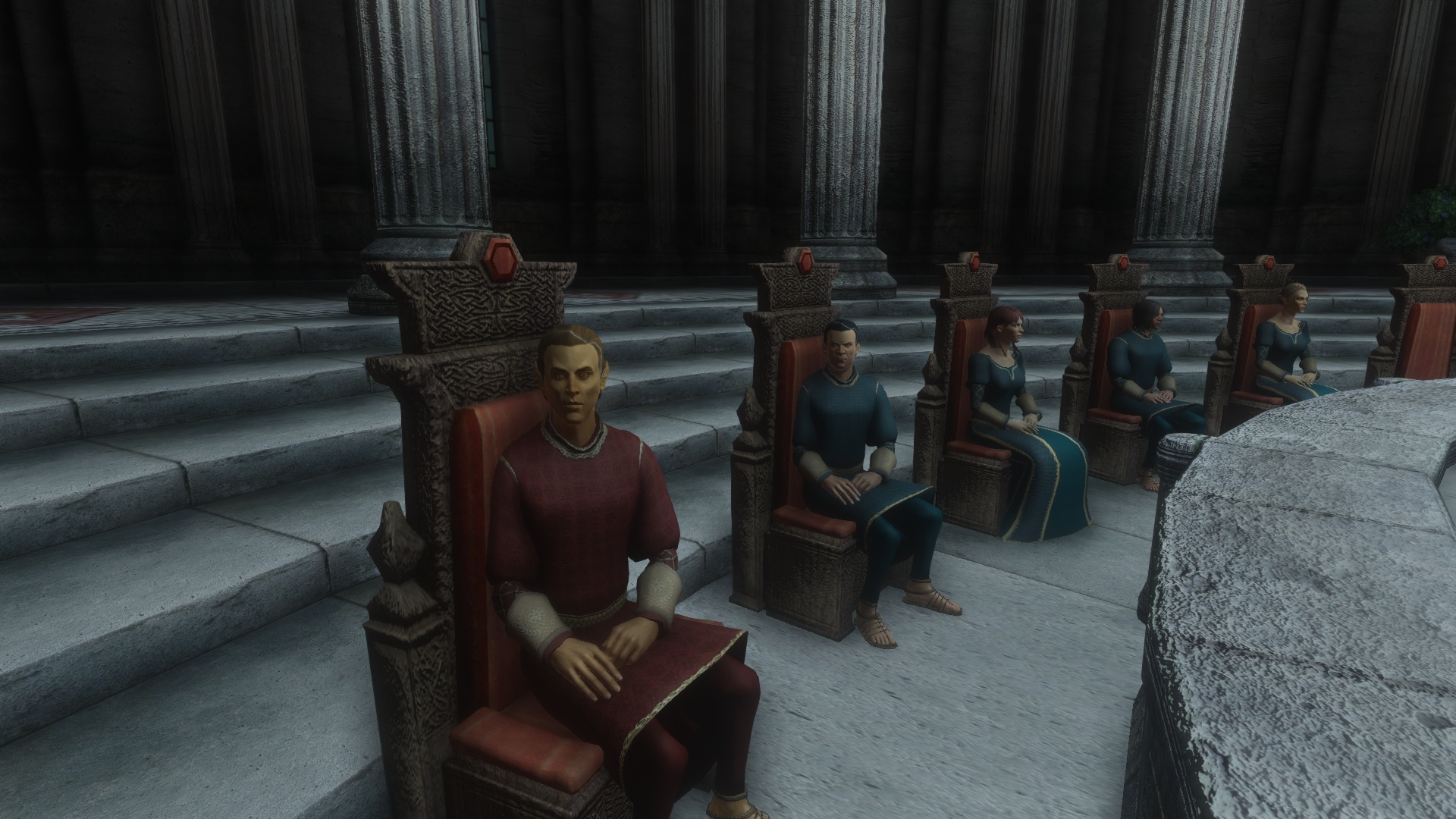 Совет Старейшин состоит из двадцати шести представителей знати, но, поскольку в Империи бушует Кризис Обливиона, многим из них пришлось отправиться в родные провинции и большую часть времени вокруг стола заняты лишь половина кресел. Но и те, кто остались, не могут посвящать все свое время управлению государством. У каждого советника свое расписание, в соответствии с которым они едят, спят и занимаются своими делами. Если ваш вопрос не является делом государственной важности, вы можете обратиться в Общий Департамент, расположенный непосредственно над залами Совета.