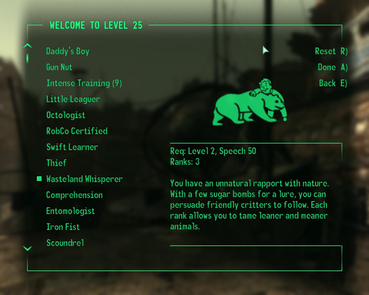 Приятель пустоши - У вас неестественная связь с природой. С несколькими сахарными бомбами для приманки, вы можете приручить дружелюбных тварей следовать за вами. Каждый ранг способности позволит вам приручить все более голодных и одичавших животных.