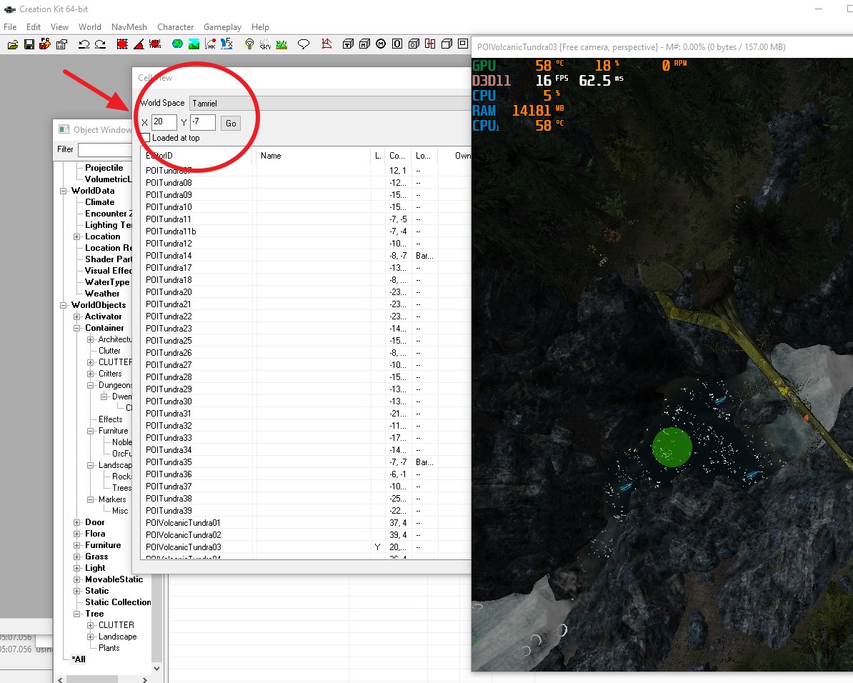 Этот мод пригодится прежде всего моддерам и почти бесполезен для обычных игроков. Вам никогда не приходилось подолгу проводить в окне рендера Creation Kit, пытаясь отыскать нужное место? Например, путешествуя по Скайриму в игре, вы нашли хорошее место для вашего нового дома, подземелья или чего угодно. А потом надолго застреваете в редакторе, пытаясь найти это место. Этот мод избавит вас от необходимости ручного поиска. Мод добавляет книгу, которая при использовании показывает координаты ячейки, в которой вы находитесь, и значение высоты. Теперь достаточно просто запустить Creation Kit и ввести полученные координаты в окне Cell View.