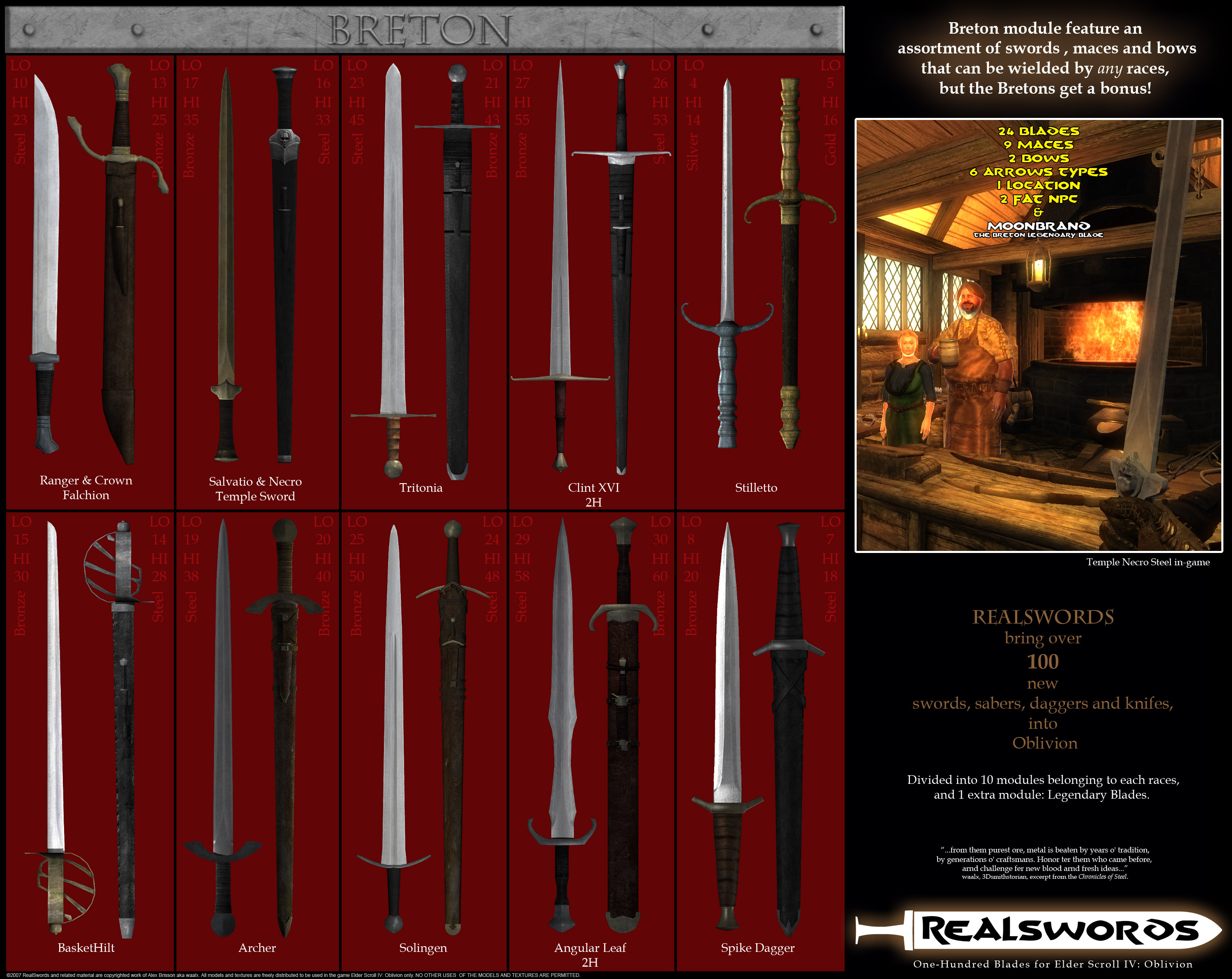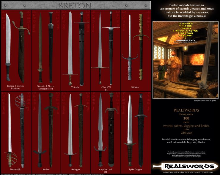 Серия плагинов Real Swords наделяет собственным оружием расы Обливиона, при использовании его представителем расы у него добавляется бонус, разный в каждом случае.