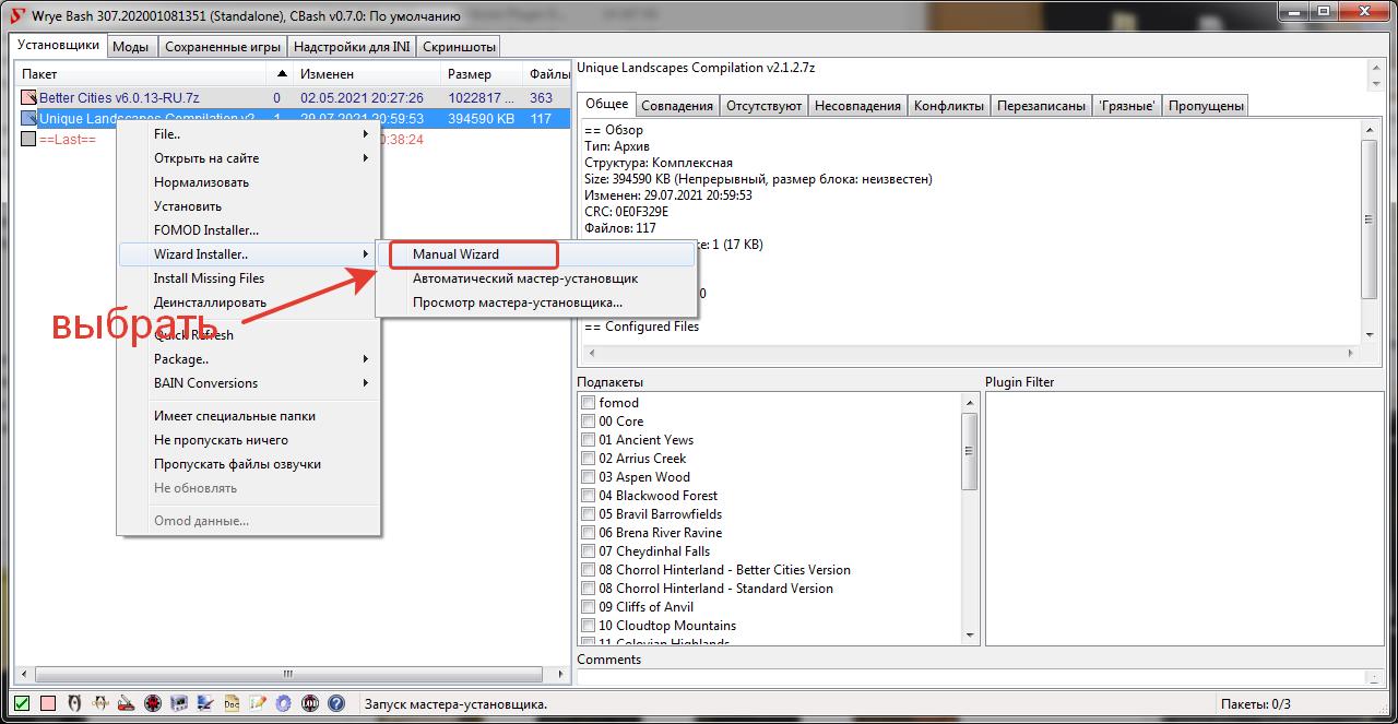 Кликнуть ПКМ на пакете c модом и выбрать Wizard Installer >> Manual Wizard