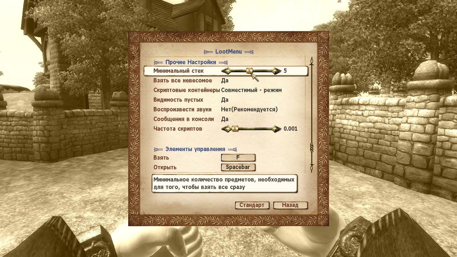 Поэтому я поменял местами клавиши управления. Теперь за открытие контейнера отвечает привычная клавиша активации, а забрать предмет из LootMenu можно с помощью клавиши "Достать оружие" (F по умолчанию)
