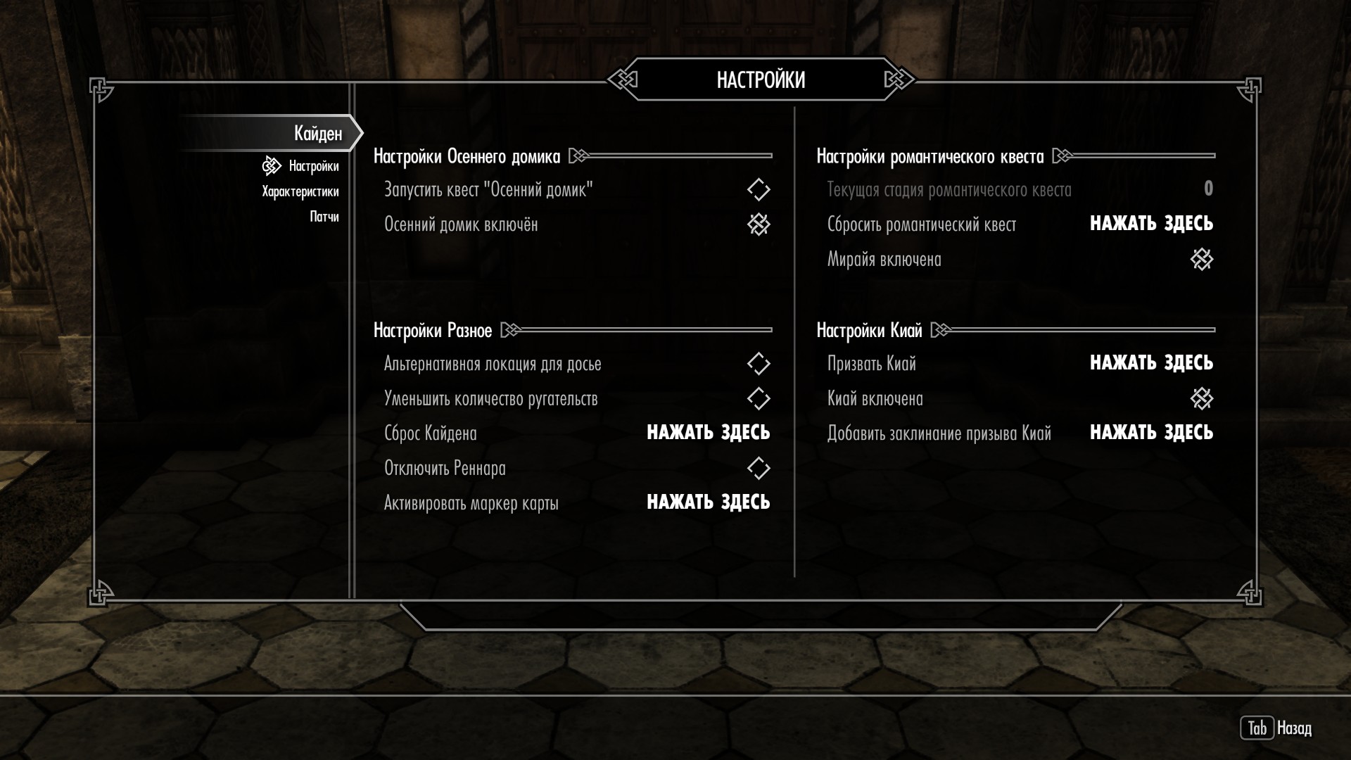 Также мод добавляет МСМ меню для настройки мода. Меню позволяет просмотреть навыки и атрибуты (магия, здоровье и запас сил) Кайдена и изменить некоторые из них. Кроме параметров, меню содержит различные опции, которые позволяют сбросить ИИ Кайдена, принудительно начать некоторые квесты и многое другое.