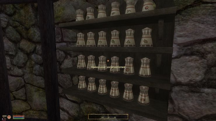 Активация полок с ингредиентами обычно открывает их как обычный контейнер; однако все, кроме ингредиентов, которые в них хранятся, будет сразу возвращено в ваш инвентарь после закрытия меню. Активация их во время подкрадывания отобразит две дополнительные опции: автоматический сбор всех ингредиентов, которые у вас есть в данный момент в хранилище, и включение самого общего хранилища. Включение общего хранилища связывает полку с централизованным контейнером для хранения ингредиентов, и перемещает все ингредиенты, которые в настоящее время хранятся, в общую "систему". Это тоже можно выключить/включить в любое время, и каждая полка хранилища может быть отделенной от всех других, то есть полки в холле гильдии Скинграда могут быть связаны с общим хранилищем, тогда как полка в Анвиле может иметь локальное хранилище.