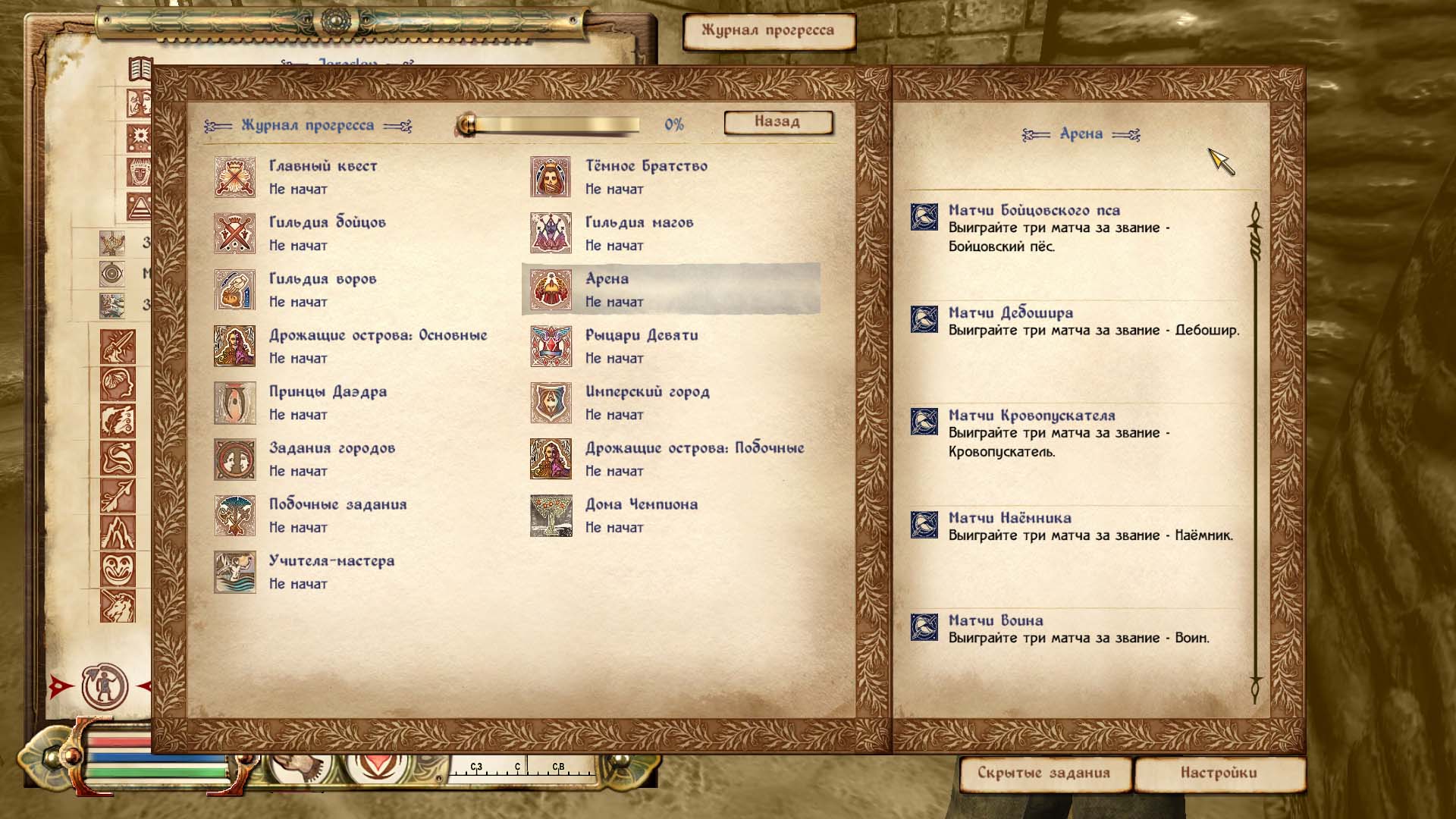 - Включены ванильные и DLC (не требуются) журнальные задания + ранги Арены