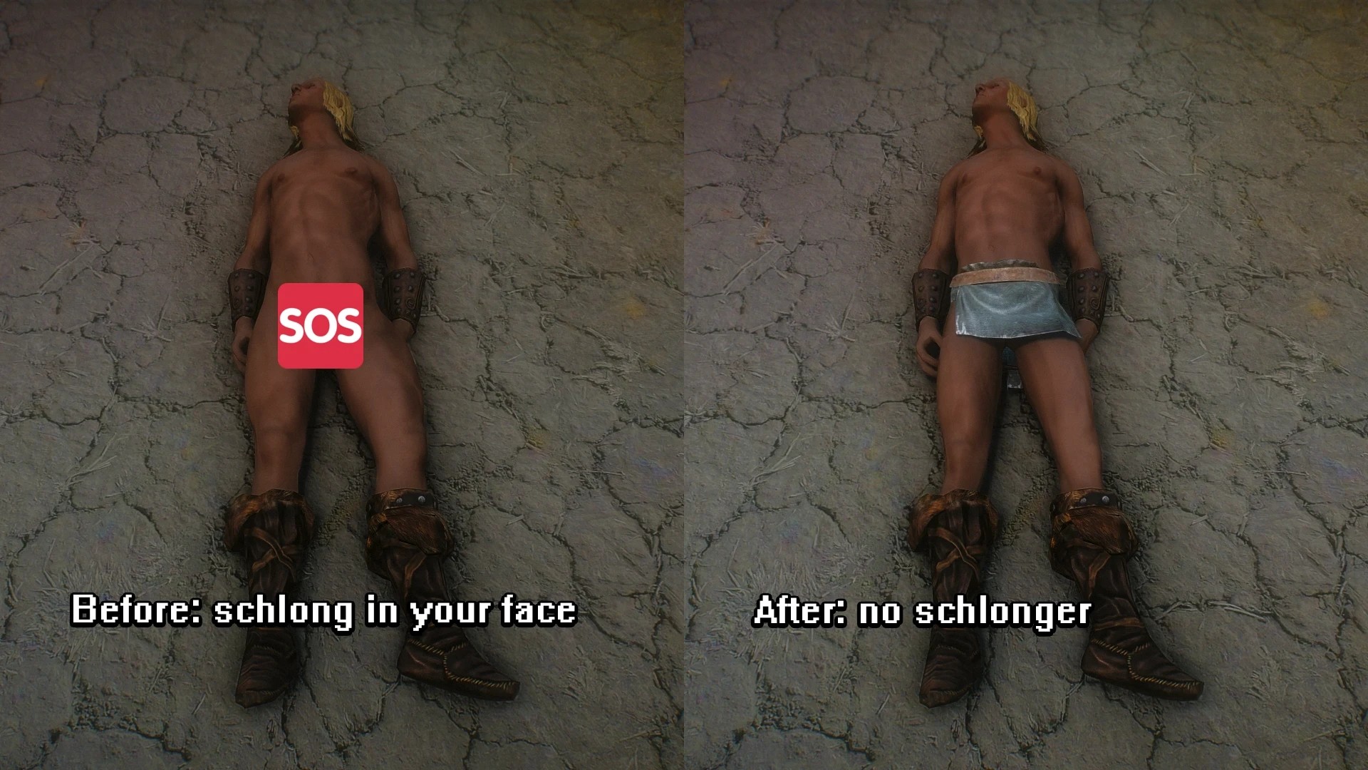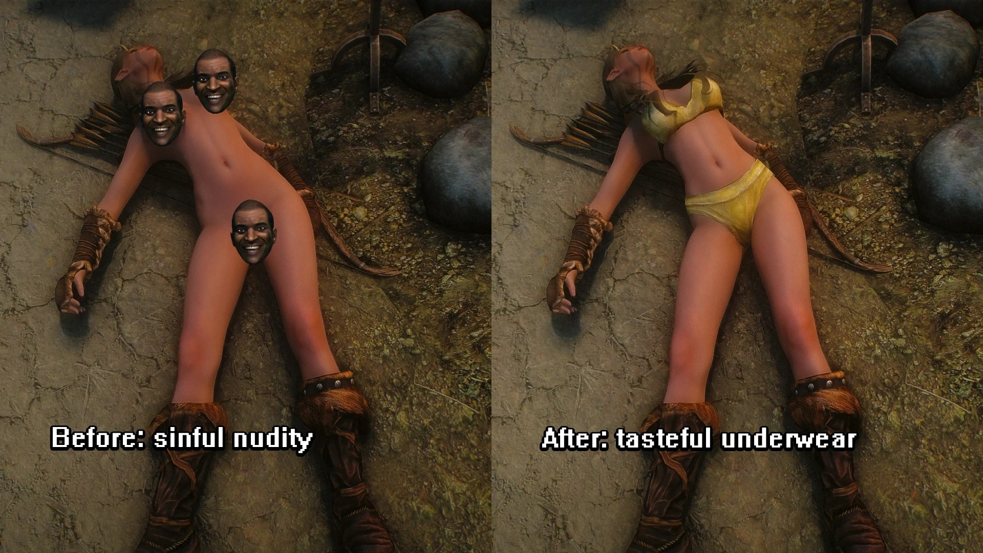 У вас установлены реплейсеры тела без нижнего белья и вам надоело смотреть на обнажённые трупы врагов или на голых NPC, у которых вы украли одежду? Этот мод решит вашу проблему. Мод добавляет всем НИПам (за исключением компаньонов) нижнее бельё, в котором они остаются при ограблении или после смерти. При желании нижнее бельё также можно забрать. Бельё экипируется только при необходимости.