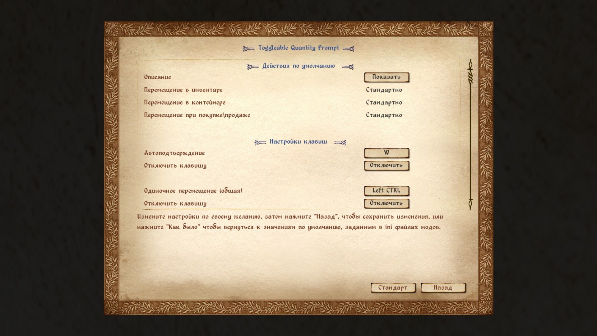 Есть два набора КМ: один для меню инвентара и второй для меню контейнера и торговли. Клавиша должна быть зажата.Если для этих меню действие по умолчанию отлично от стандартного, то для режима по умолчанию 'по одному'
