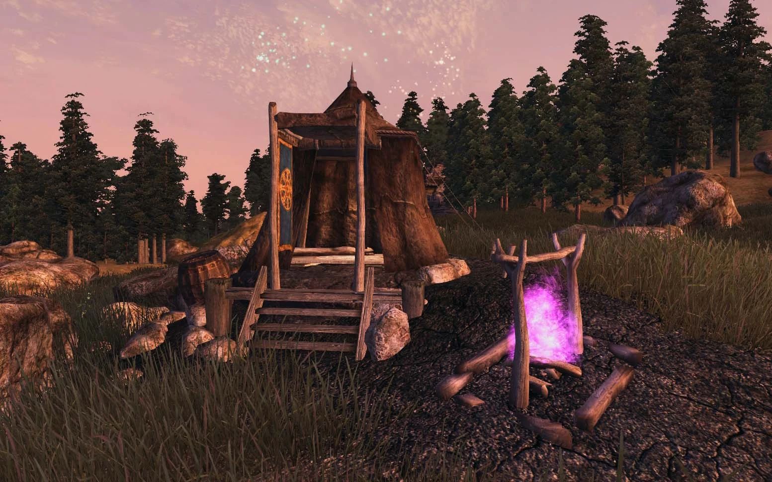 В базовой игре мастер Разрушения Бралса Андарен живет в дикой местности, имея только спальный мешок под каким-то камнем. Этот мод размещает в этом месте небольшой лагерь в волшебном стиле, а также добавляет для него маркер на карте. Если кому интересно, она живет на северо-западе от форта Дирих.