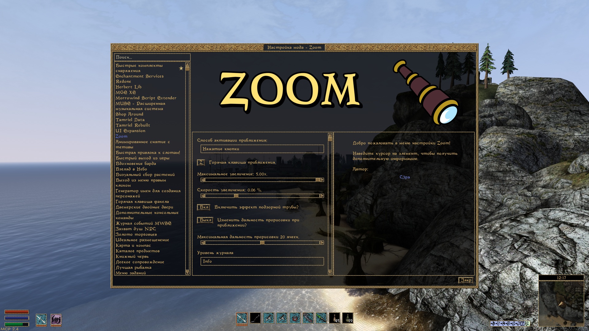 Этот мод добавляет режим Zoom и позволяет приближать изображение. В меню настройки мода можно установить максимальное приближение, скорость приближения и горячую клавишу активации.
