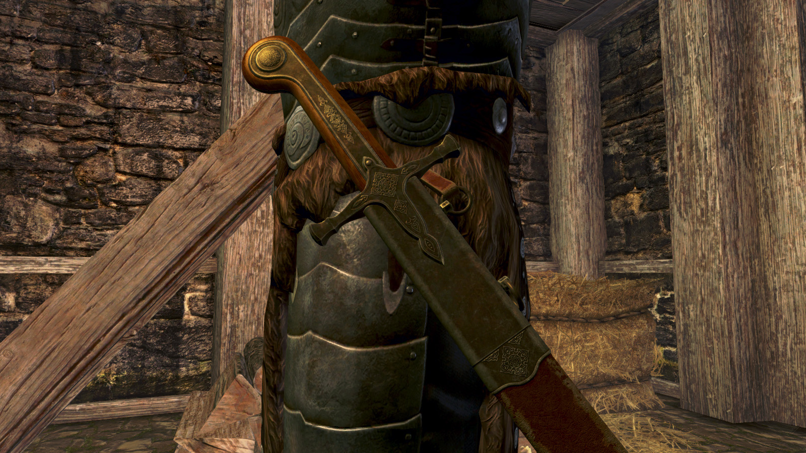 В категории "опциональные файлы" доступна версия без ремешка на ножнах (ScimitarNoStrap_LE.rar) для модов, позволяющих носить оружие на спине (устанавливать поверх основного мода).