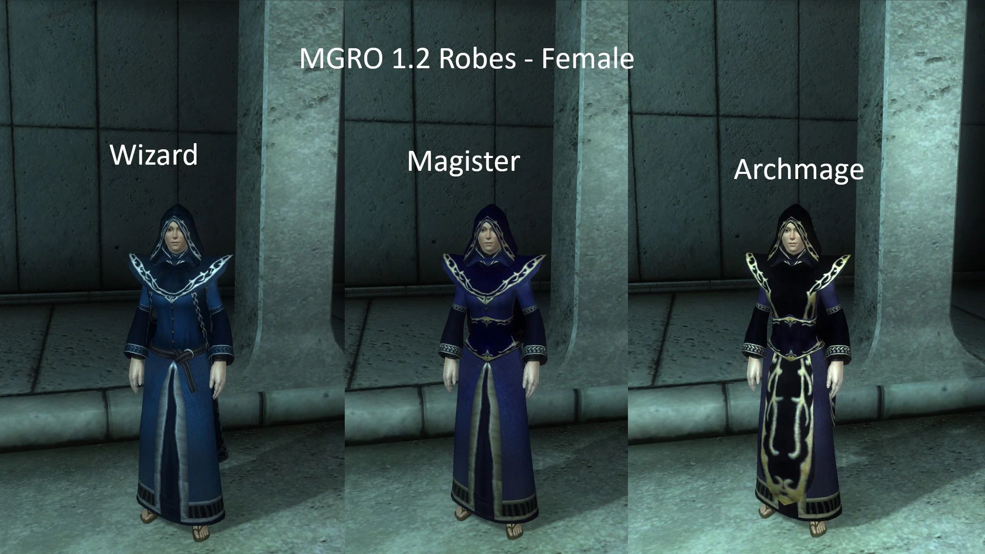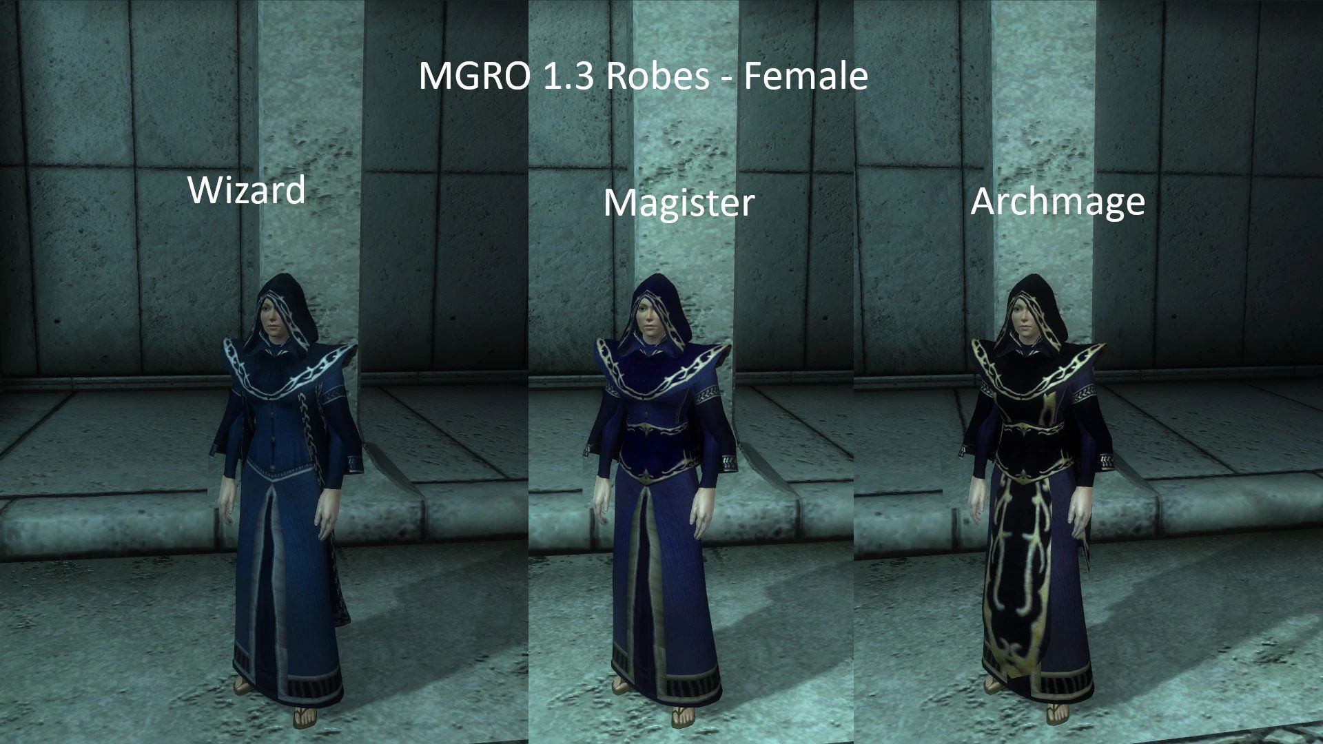 MGRO улучшает внешний вид мантий Гильдии магов, придавая им чуть больше солидности. Оригинальное видение магии Oblivion было сохранено в качестве основы этой переработки, чтобы мантии не выглядели чрезмерно кричащими, роскошными или иным образом неуместными.