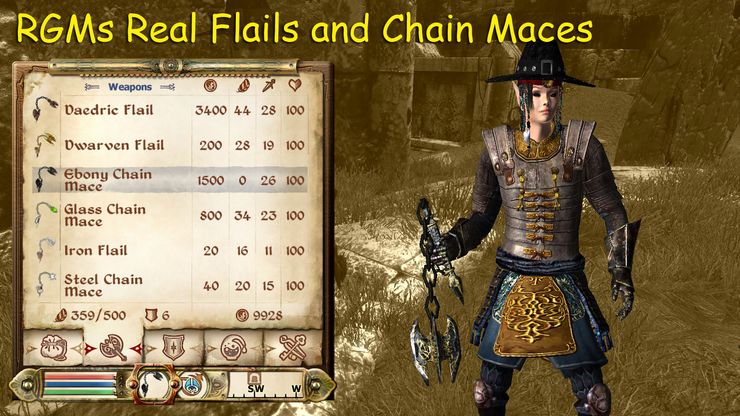 Этот мод добавляет в Oblivion настоящие цепы и цепные булавы. В комплект входят шесть цепов, привязанных к костям кнута в скелете Coroneras с максимальной совместимостью. Для их использования требуются анимации NoMaam Flail Animations от Fore (добавлено в папку мода, качать отдельно НЕ НАДО) и OBSE 20. Если вы не скачаете и не установите новые анимации, эти цепы будут просто неподвижным оружием; для их движения необходимы анимации, как у цепов и цепных булав. Поэтому, если вы собираетесь использовать их, у вас должен быть скелет с максимальной совместимостью и анимации NoMaam Flail Animations.