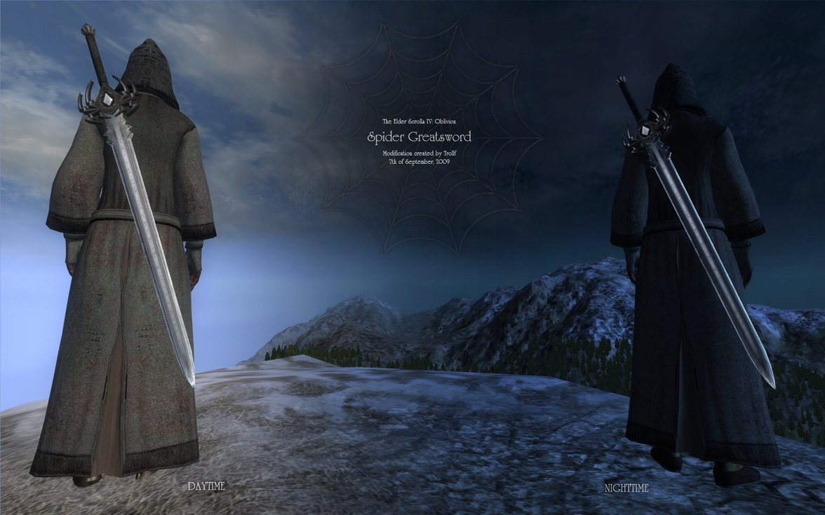 ̴• Двуручный меч паука - можно купить в магазине "Молот и наковальня" в Скинграде. Меч более могучий, чем даэдрическая клеймора, так что он весьма дорогой. Новая модель, новая текстура, и меч светится в темноте.