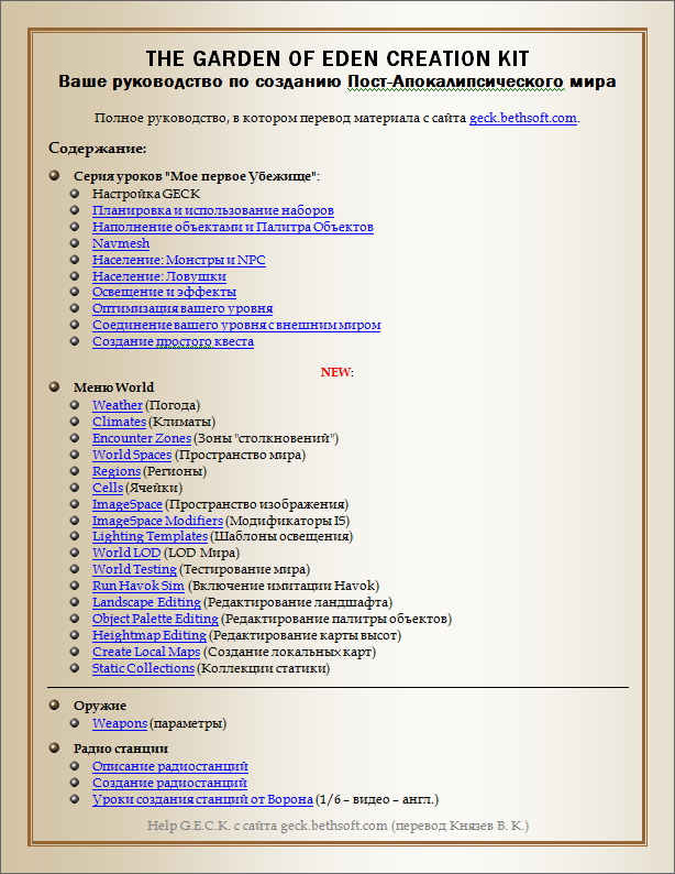 Полное руководство к программе G.E.C.K на русском языке, перевод материала с сайта geck.bethsoft.com. Модостроение для Fallout 3 от А до Я!