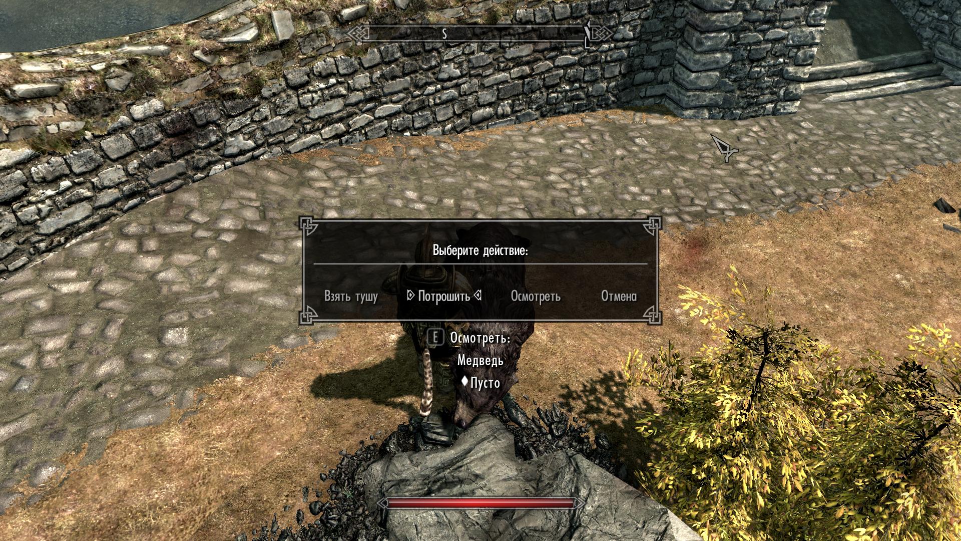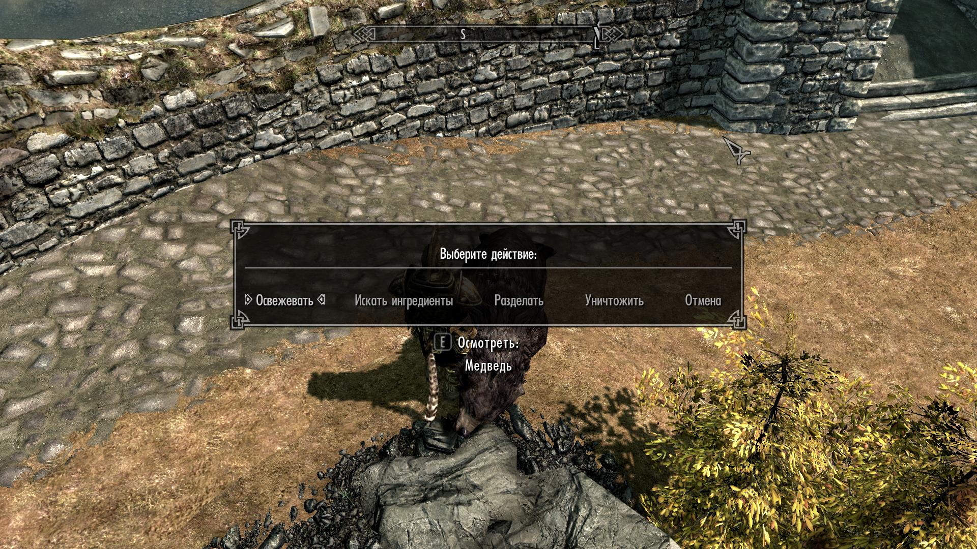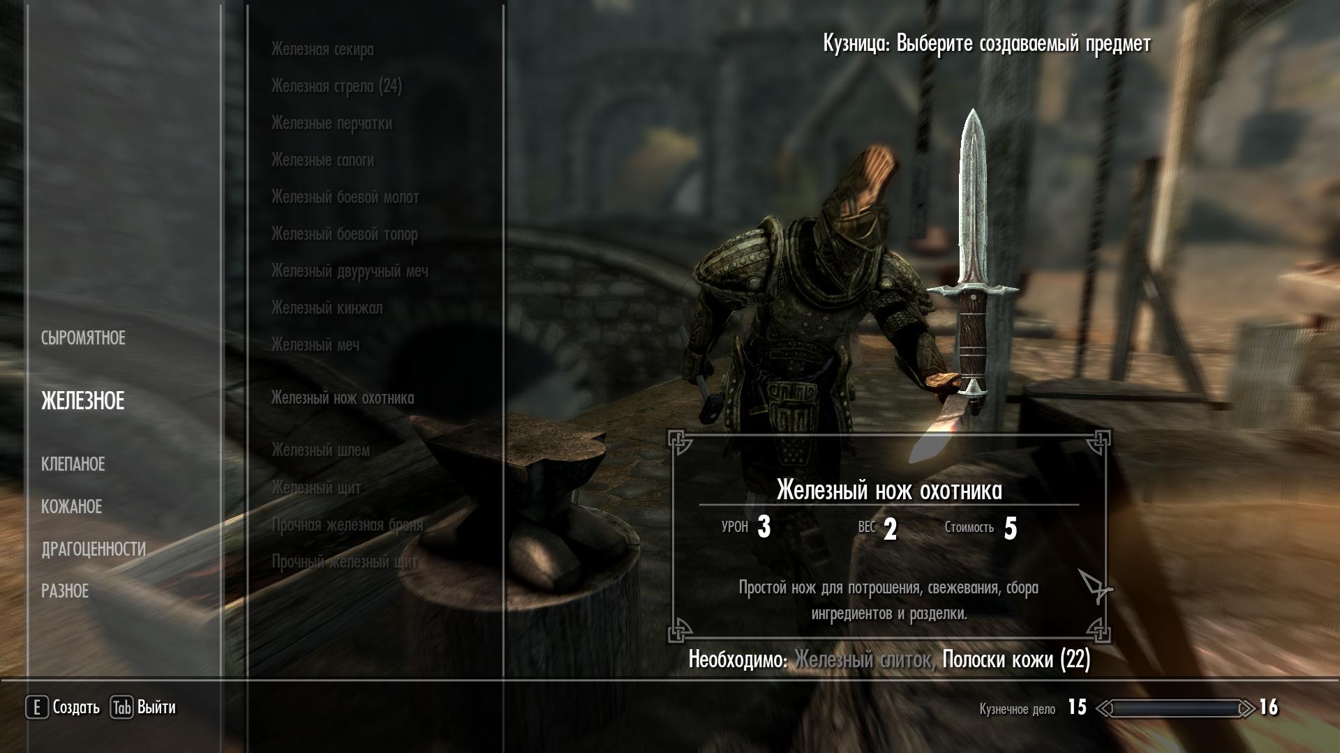 Для манипуляций с тушами (свежевание, поиск ингредиентов и тд) нужен нож охотника. Если его нет, но есть обычный кинжал, Hunterborn применит его. Если нет и кинжала (и ваш герой не каджит/аргонианин) тогда активируйте умение "Фураж" и поищите заостренный камень. Самые простые охотничьи ножи вы можете сделать, воспользовавшись талантом "Резьба". Более продвинутые ножи куются в кузнице и для производства требуют те же перки, что и стандартное оружие (к примеру, для стеклянного охотничьего ножа нужен перк на ковку стеклянных доспехов). Многие ножи имеют бонусы и/или штрафы на время, затрачиваемое в процессе обработки туш. Более подробно о ножах и их бонусах читайте в Hunterborn Tips and Spoilers в основном архиве.