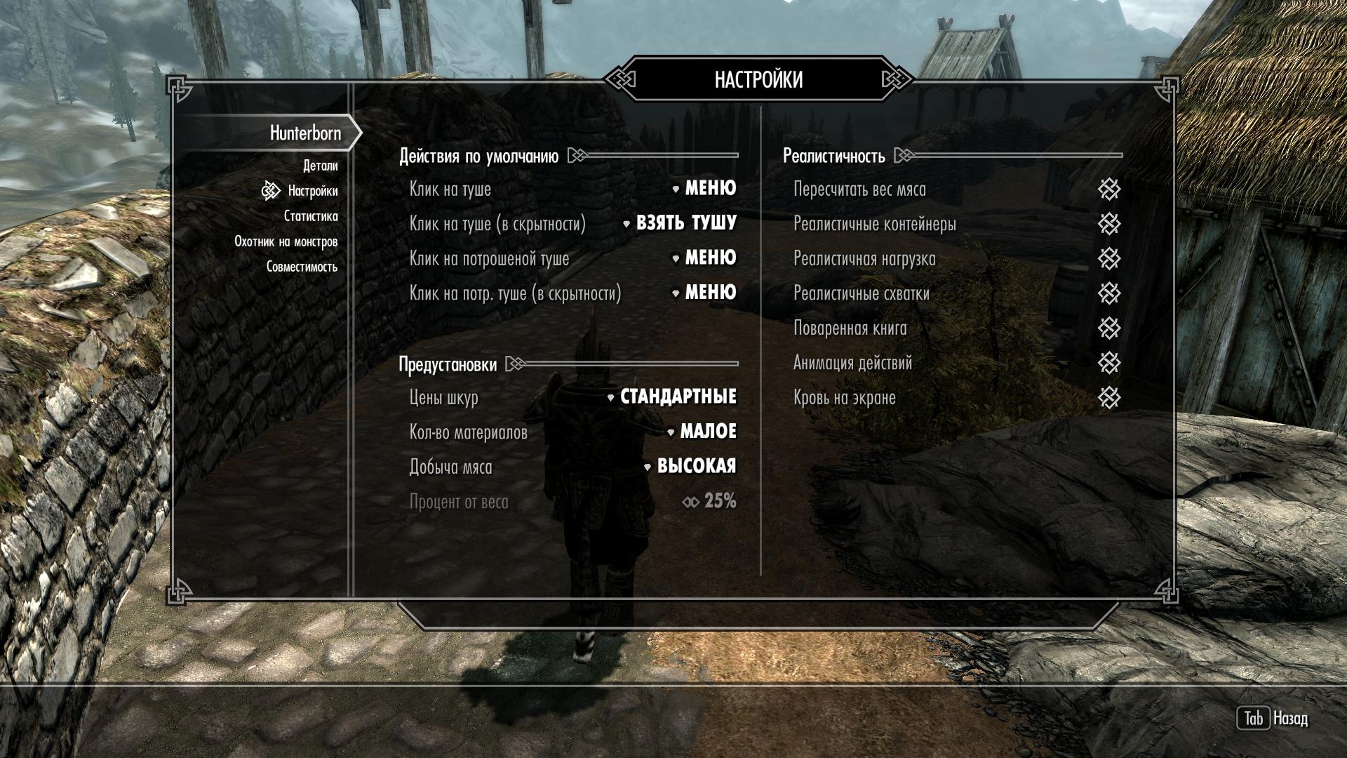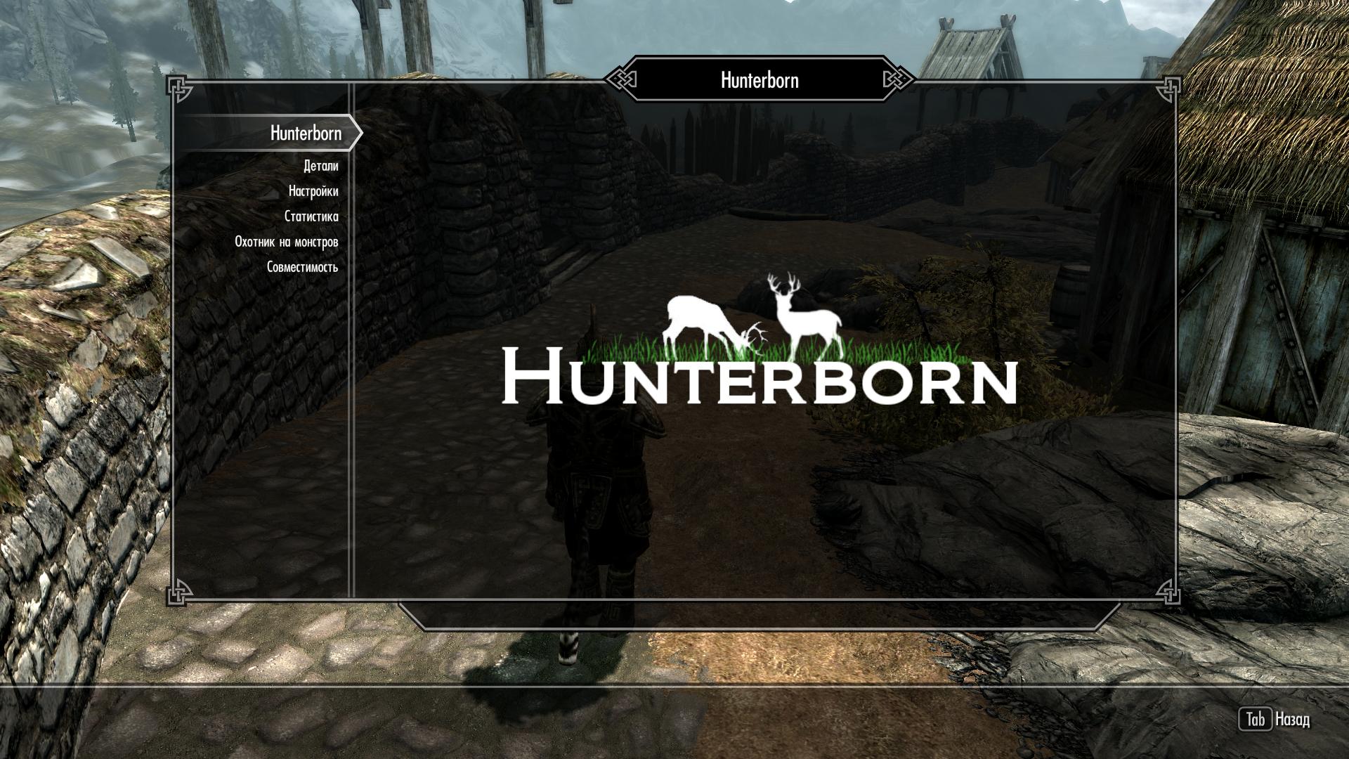 Hunterborn при включении добавит вашему герою 4 новых умения: потрошение (подготовка туши к дальнейшей обработке), свежевание (снятие шкуры), поиск ингредиентов и разделка (добыча мяса). Использование любого умения увеличивает ваш опыт его применения. Любые действия с тушей убитого животного занимают какое-то игровое время, но по мере роста "охотничьих" умений время, затрачиваемое на манипуляции с тушей, будет сокращаться, а ваш герой будет добывать шкуры и ингредиенты лучшего качества. Прогресс в "охотничьих" умениях можно посмотреть в МСМ-меню.