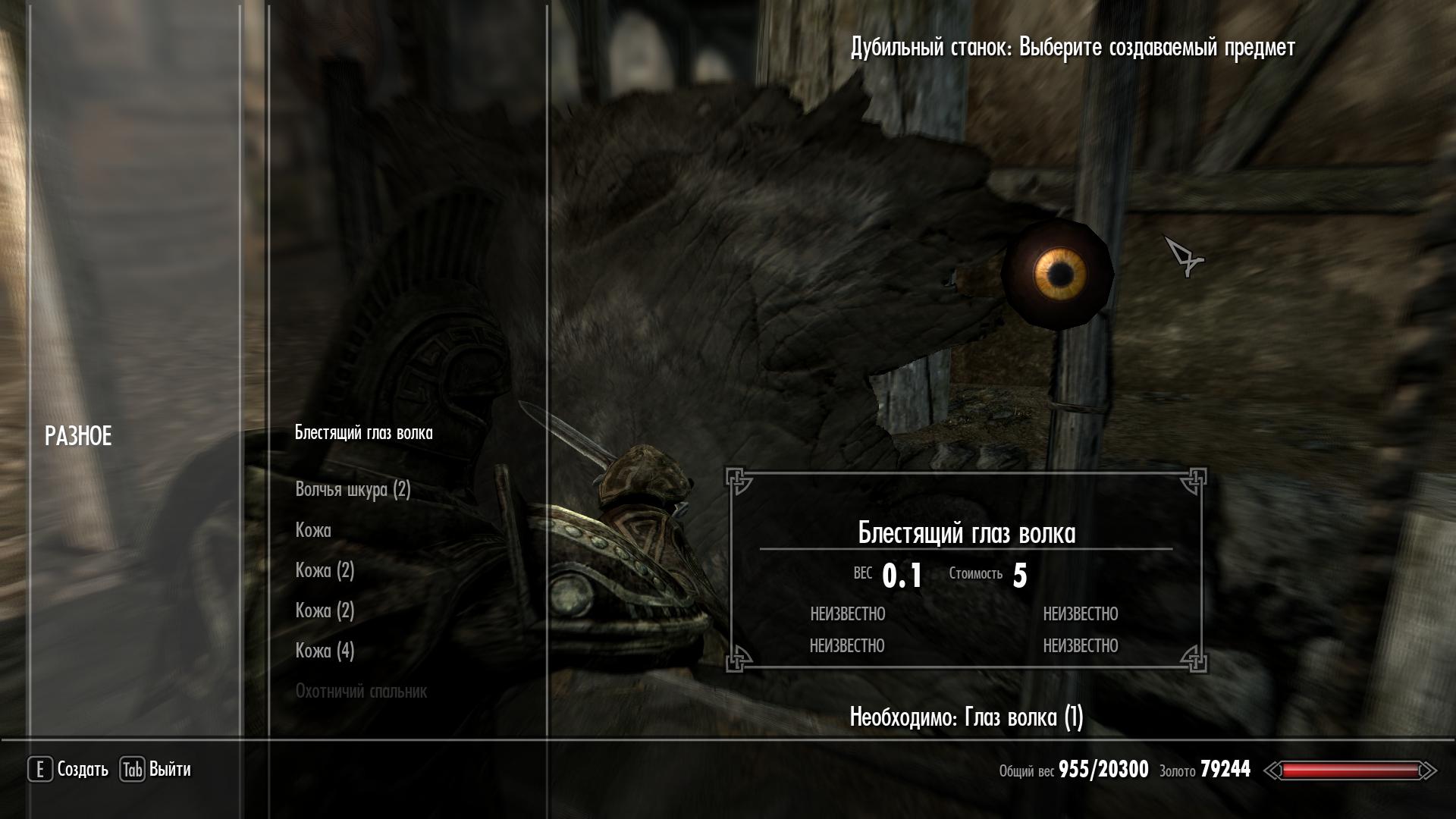 Помимо изготовления в кузнице охотничьих ножей вам доступны новые "рецепты" при работе с дубильным станком: например, вы можете из обычного волчьего глаза сделать на этом станке блестящий. Он (как и обычный глаз волка) тоже является алхимическим ингредиентом, однако имеет другие свойства. Ну и конечно же на дубильном станке вы можете обрабатывать как ванильные так и добавленные модом Hunterborn шкуры.