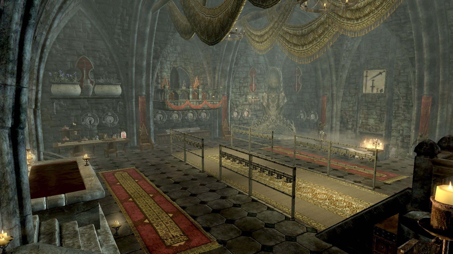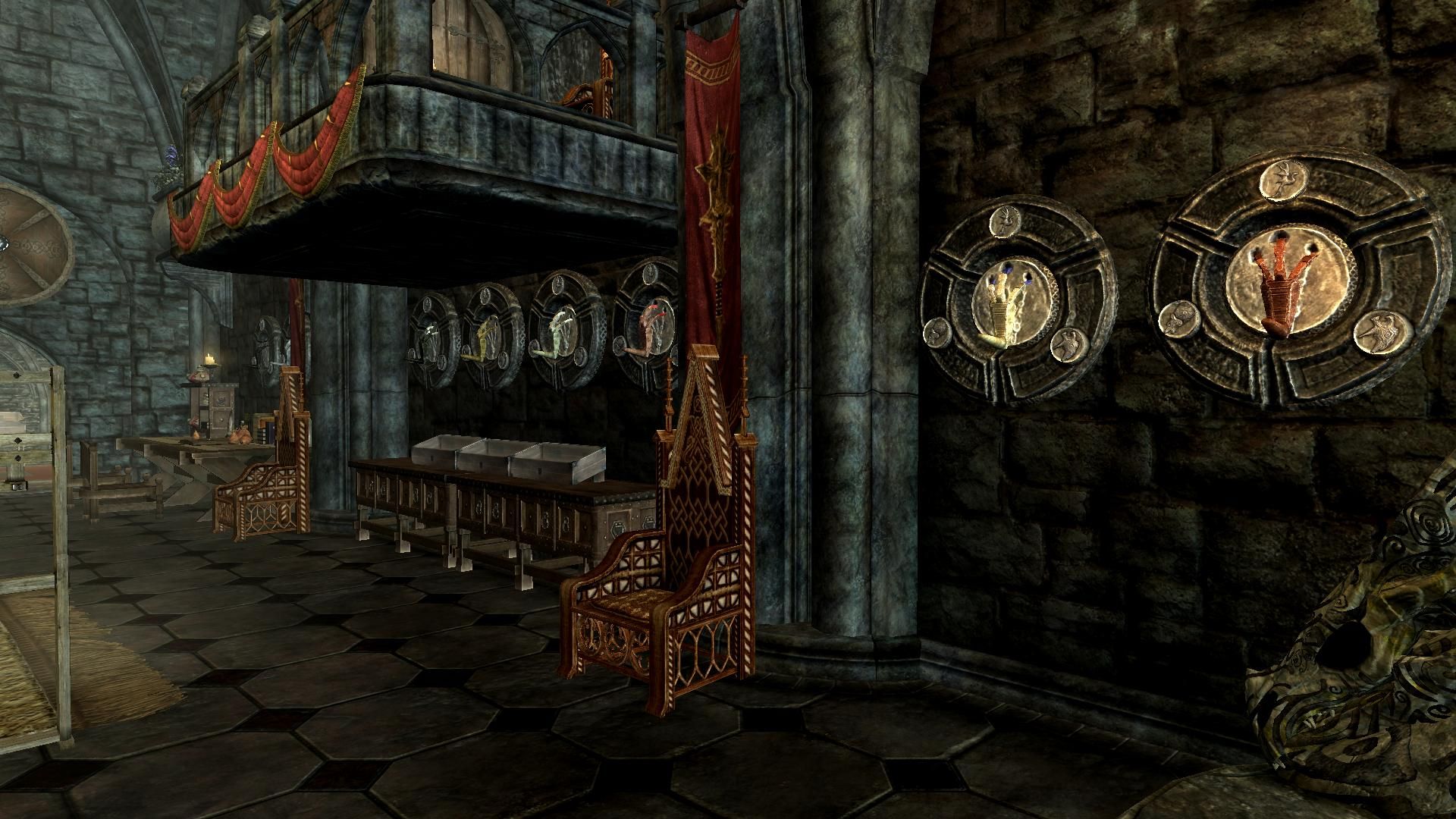 Вы найдете манекены, стойки для оружия, сундуки, витрины и многое другое. Всё это включает в себя Хранилище северной башни. Там же вы можете выставить свои маски драконьих жрецов и драконьи когти. В Южной башне вы найдете подставки и витрины под даэдрические артефакты.