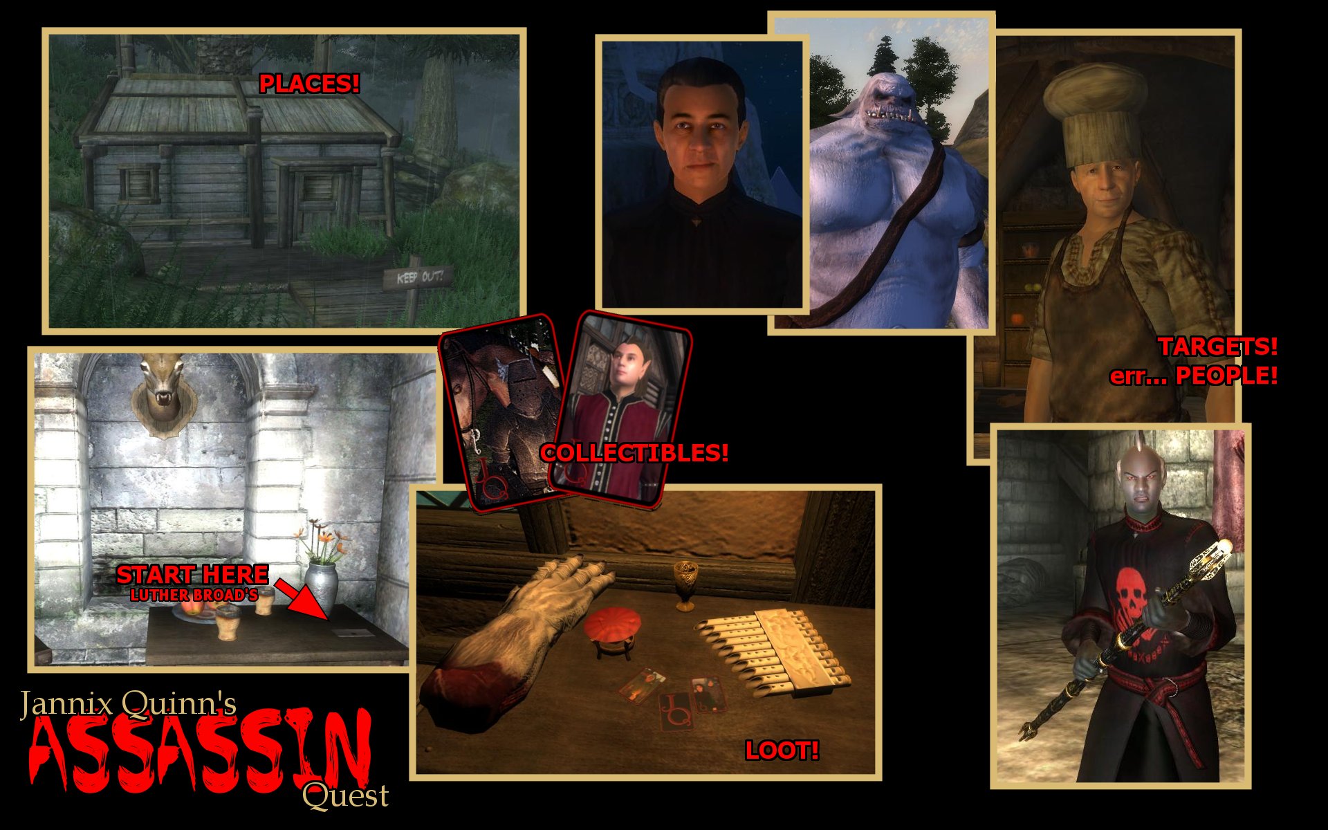 Квест для любителей стэлса и жизни ниндзя. Квест начинается в Пансионе Лютера Броада в Имперском Городе. Вы найдете примечание оставленное незнакомцем, который просит, чтобы вы убили определенного человека. Если вы решите выполнить задание, то будете хорошо вознаграждены, и вам представят следующую жертву. Убийства становятся более сложными, но и награды увеличатся соответственно. Но вы должны учитывать, что представители закона не проявят к вам никакого милосердия! Данный плагин добавляет множество целей для убийства, и различные варианты наград.