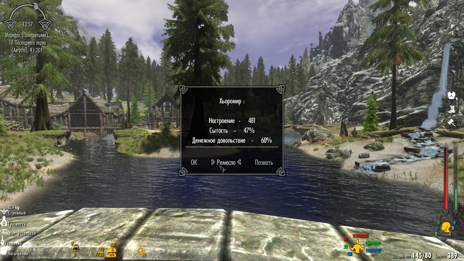 - Мод отслеживает настроение и голод у двух ваших спутников. Для этого спросите спутника "Как настроение?"