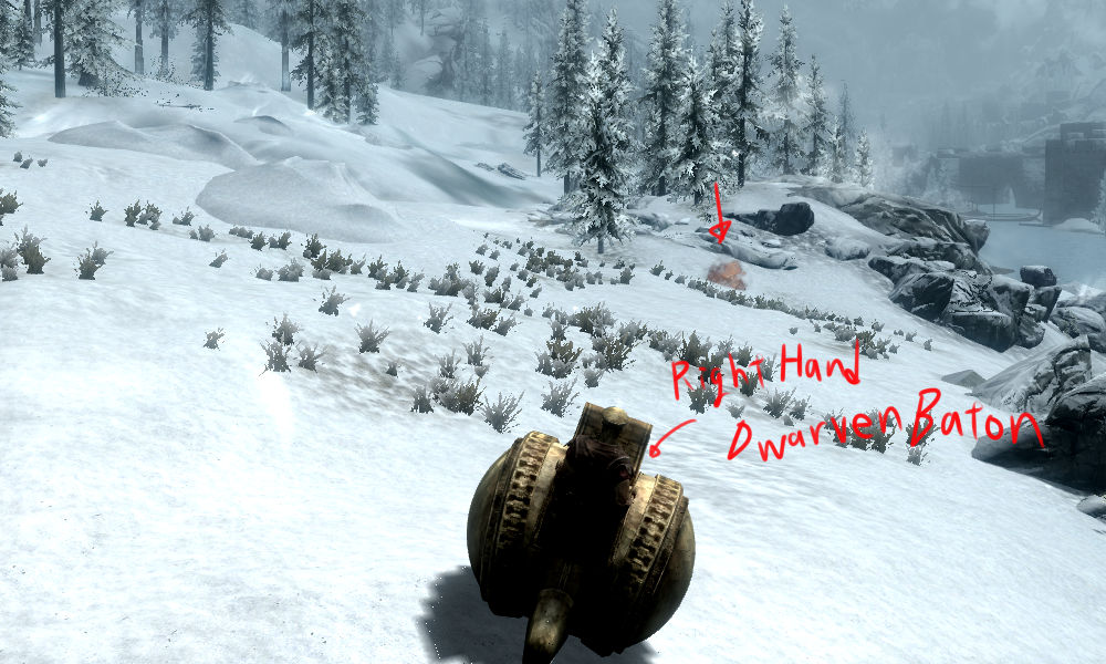 1. Вооружитесь двемерской пушкой в правую руку.