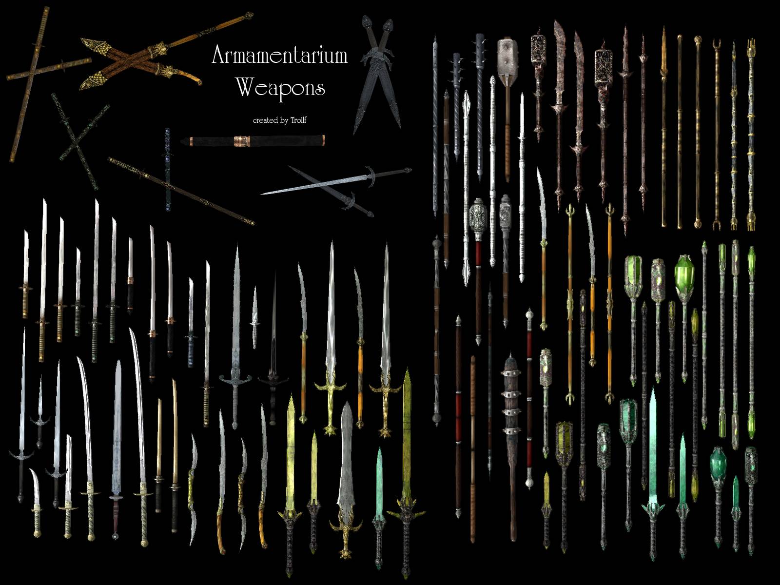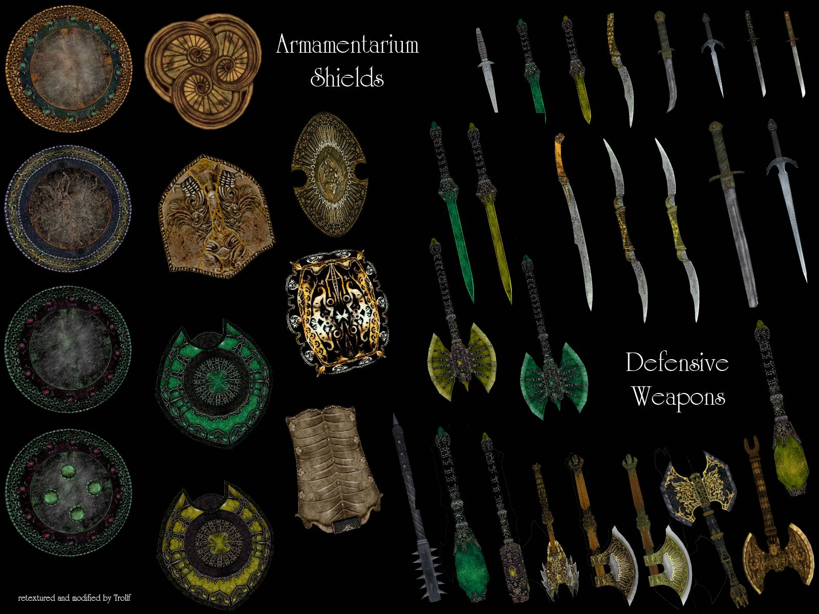 Добавляет в игру несколько сот новых предметов, а так же ретекстур кое-чего старого - броня и оружие!! Подключите есп после мастерфайла и вы сможете купить все в Скинграде в магазине Коловианские торговцы, а так же в магазине Молот и клещи!