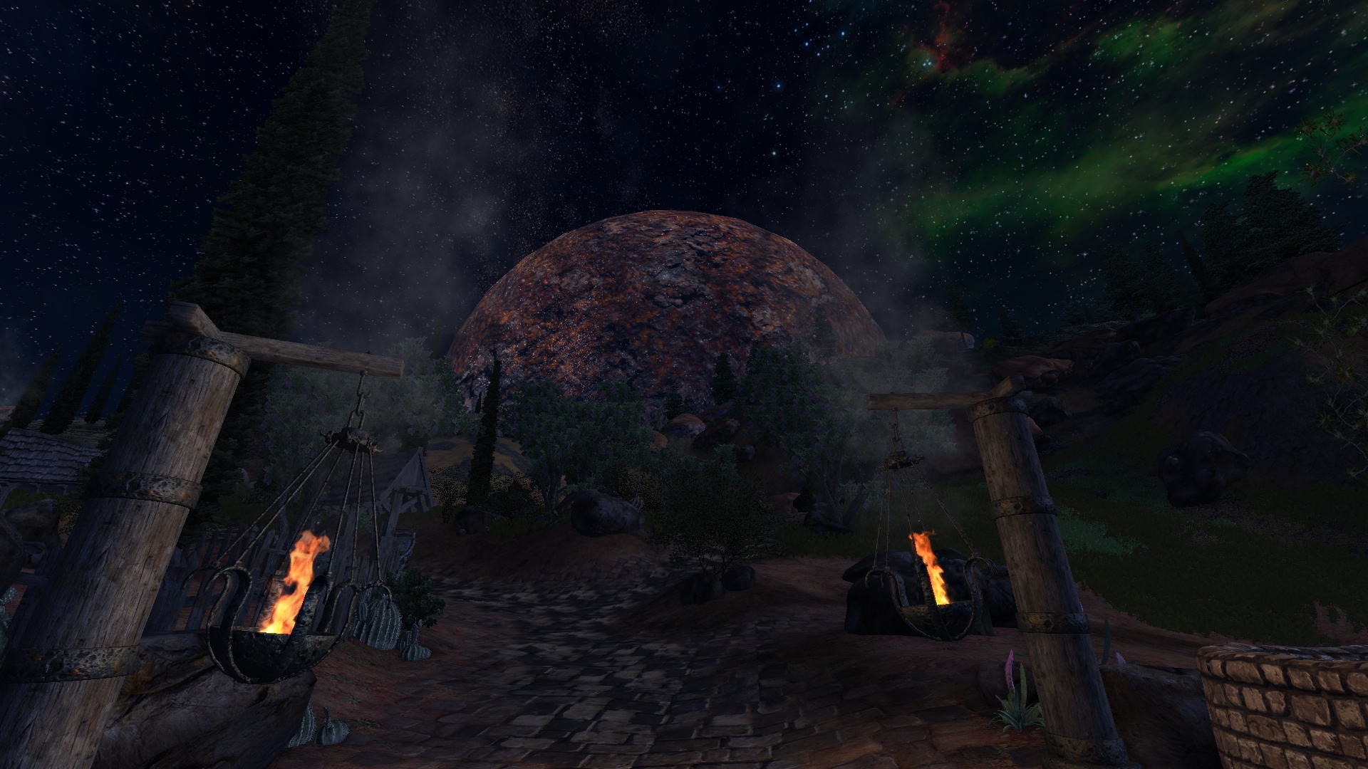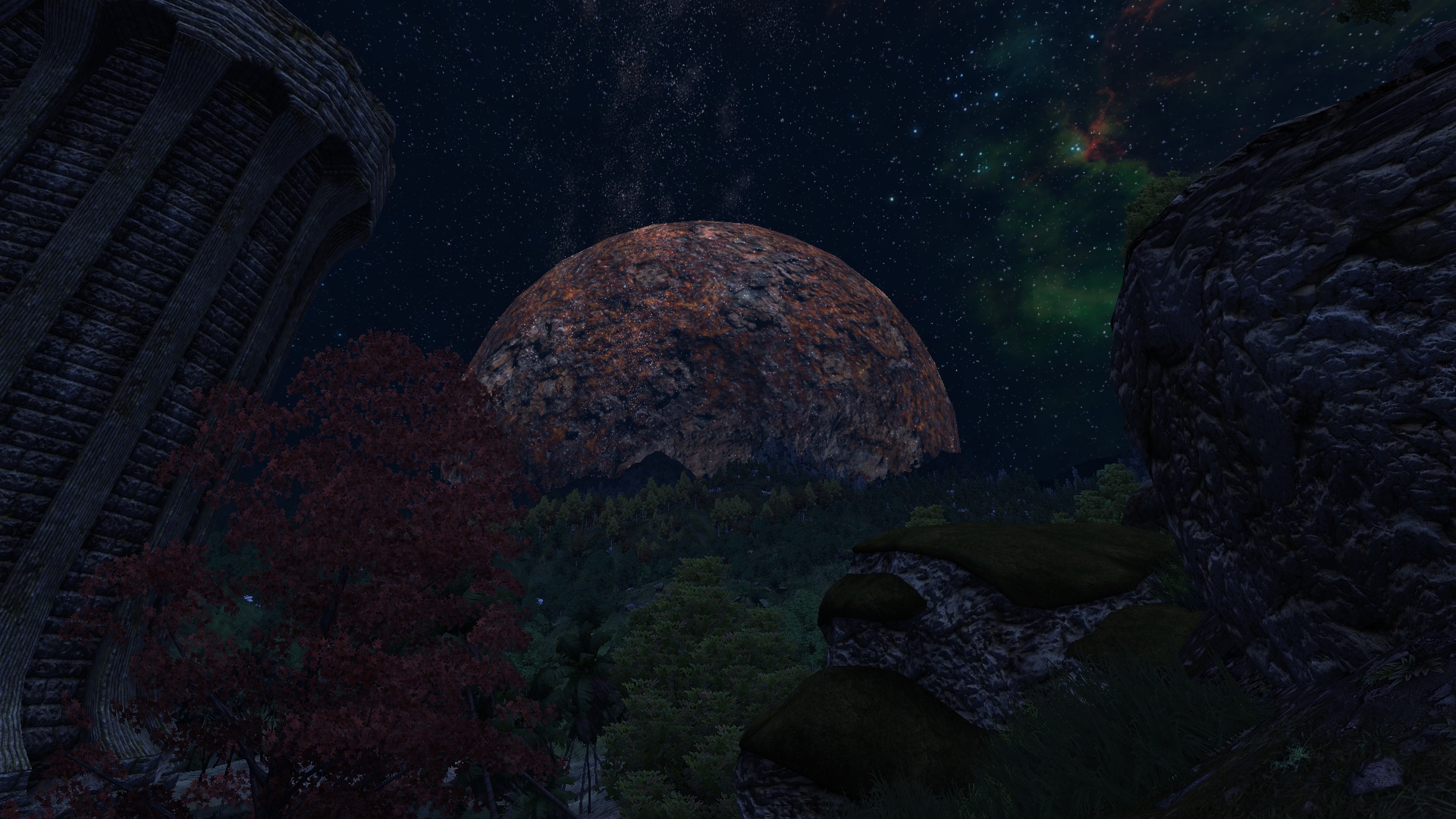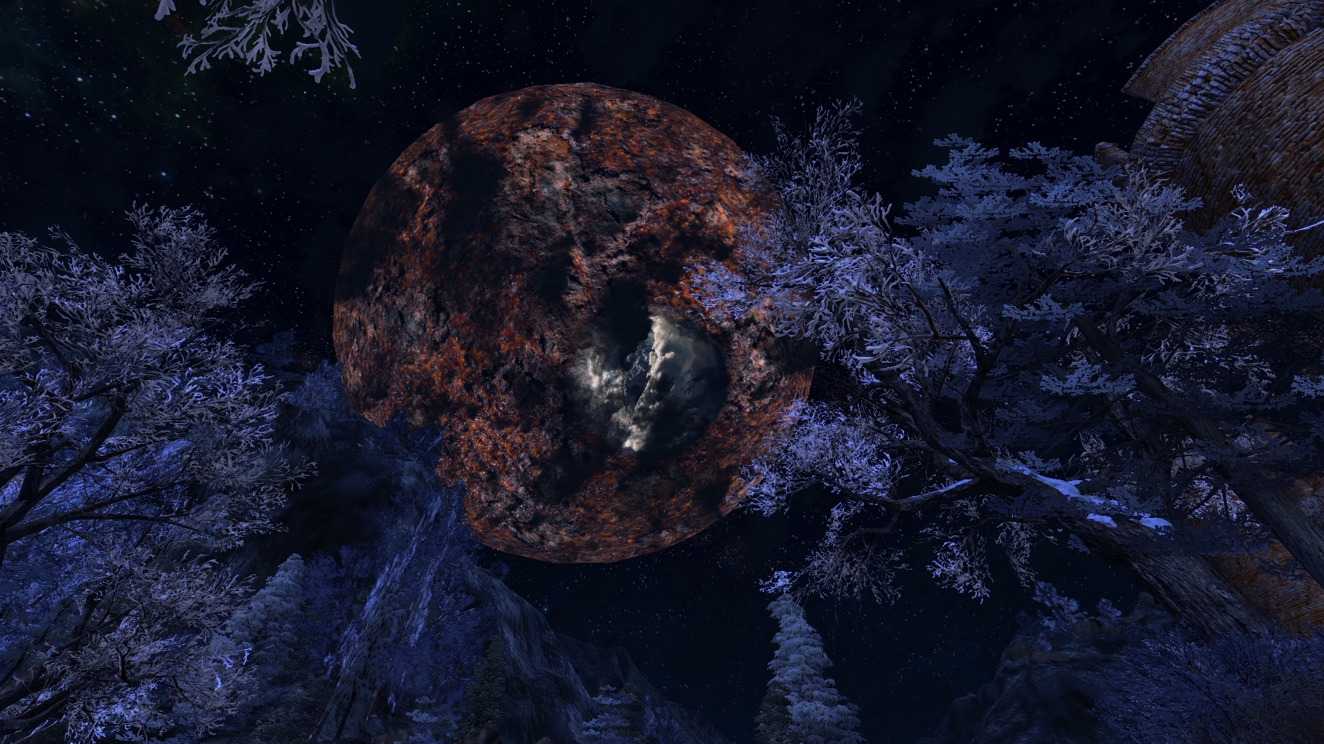 Подумав об этом, я решила изменить немного вид ночного неба, повесив рядом с Нирном планету Мертвые земли (план Дагона). Планета имеет фазы, перемещается по небосводу и бывают ночи, когда она находится по другую сторону Нирна и не может быть видна. Массер и Секунда, так как являются спутниками Нирна и находятся ближе к нему, иногда устраивают "затмение" Мертвым землям. Но их размеры слишком малы, чтобы полностью закрыть диск планеты.