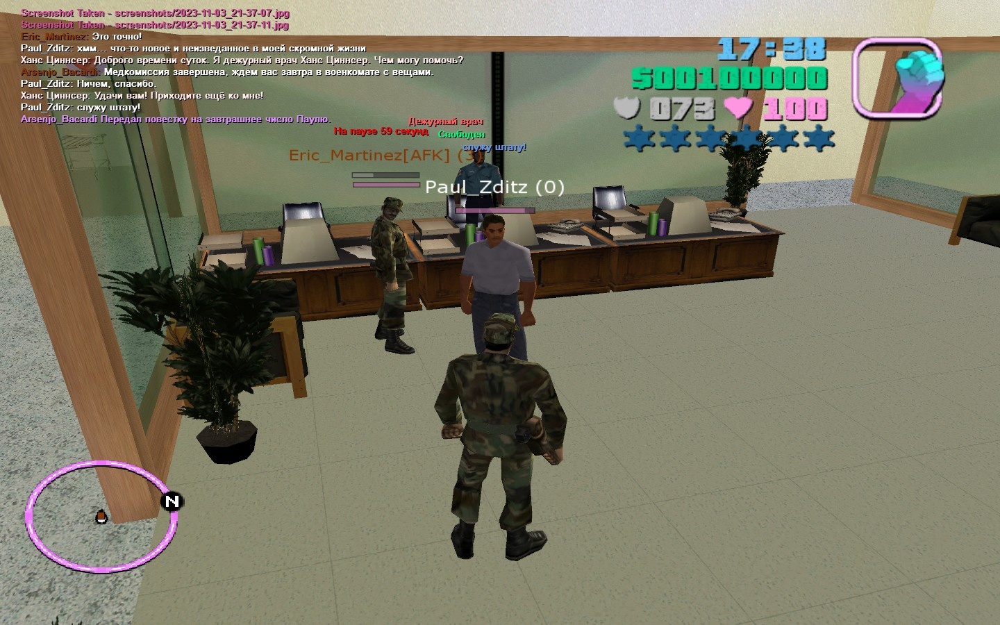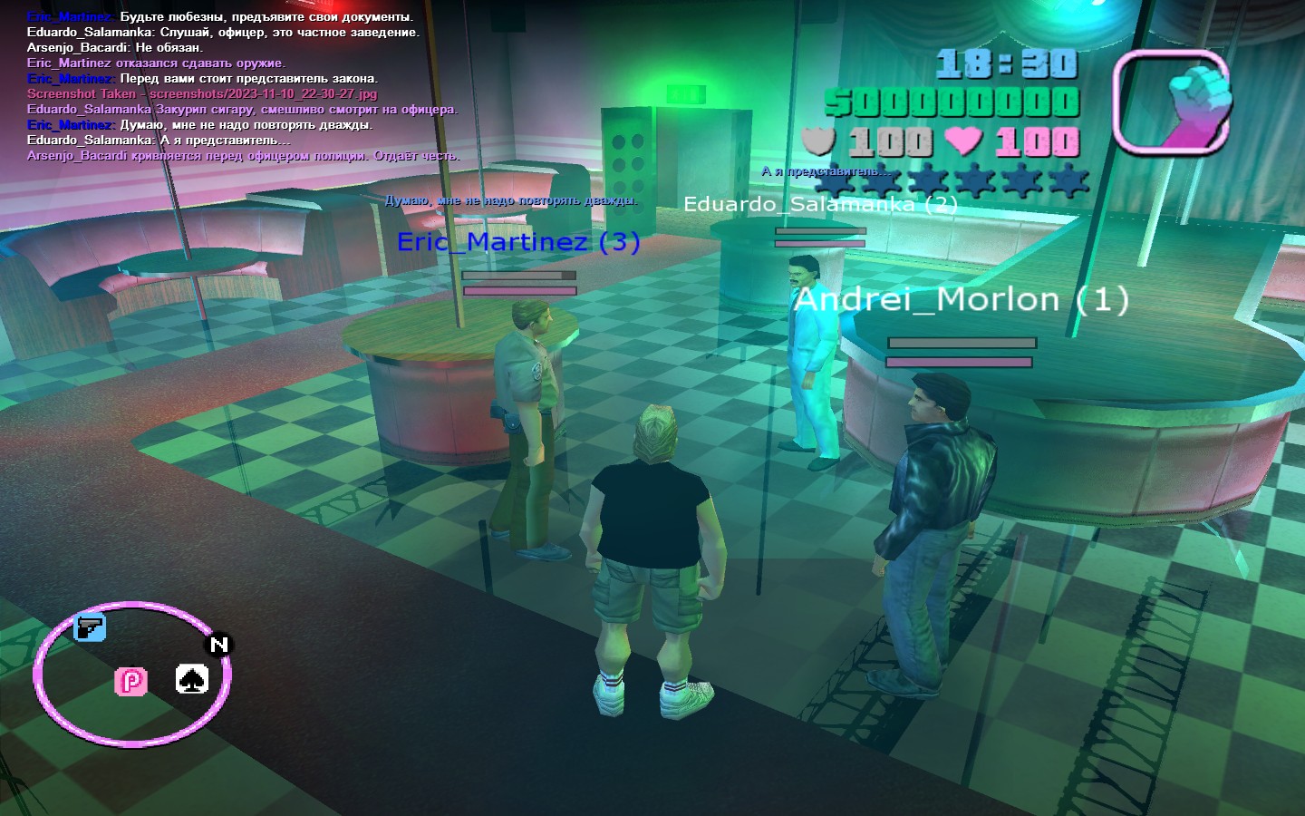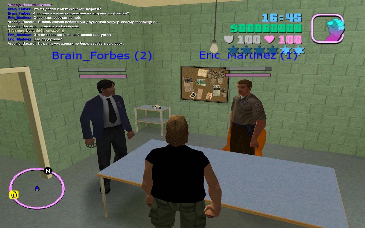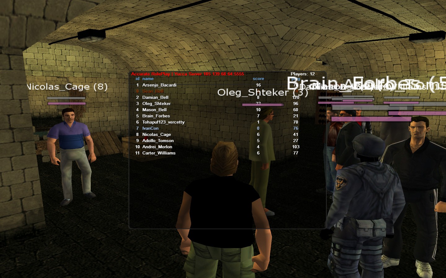 Взаимодействие с игровым миром происходит через “RolePlay” процесс, идентично SA-MP, но только на движке Вайс-Сити. В процессе игры можно зарабатывать деньги, двигаться по карьерной лестнице, вступать в банды и государственные фракции, покупать недвижимость, бизнес и машины.