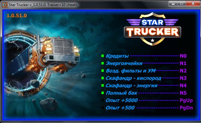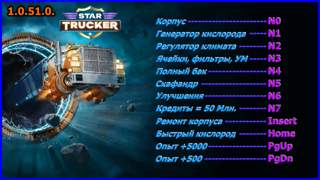 текущее состояние корпуса. Для набора опыта,перед сдачей груза нажать +500 или +5000, можно нажимать многократно и в любом сочетании. Пробоины в корпусе можно чинить на месте, все улучшения держит N6 (если была включена заранее). Перед ремонтом в стационаре отключить N0, иначе пробоины не исчезнут, для этого отключить N0, инемного повредить корпус, после чего лететь на ремонт в стационар. Если рядом нет станции, включить N1 и временно забыть о пробоинах. Для поддержания температуры +20 градусов,нажать N2 и забыть о солнечных вспышках. В экстренных случаях, когда кислород заканчивается,