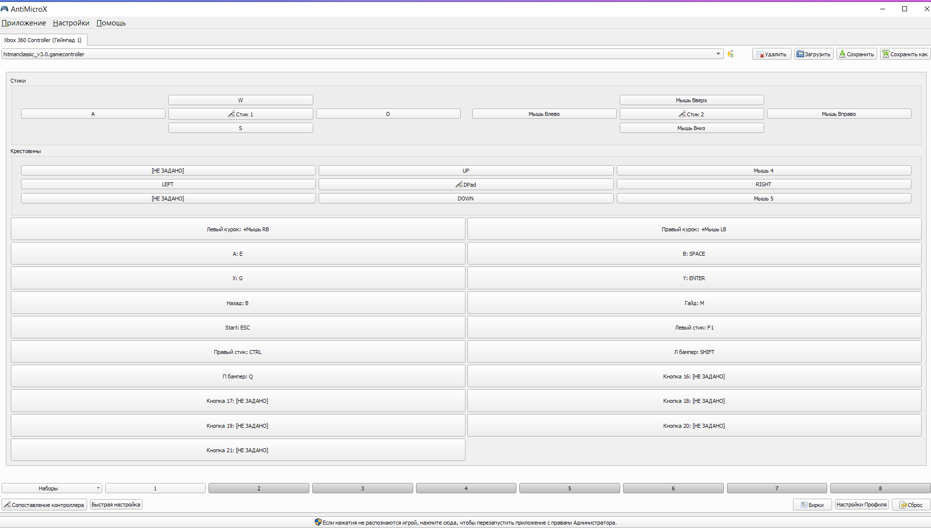 - Теперь запустите игру и в настройках игры установите скорость мыши, которая вам кажется комфортной для управления игры c контроллером (ваша скорость управления игры с контроллером будет зависеть от игровой настройки скорости мыши, поэтому не бойтесь пробовать разные значения, пока не подберёте комфортый вариант). Лично у меня в Hitman Contracs для комфортной игры настроена скорость на "16", примерно столько же должна быть в Silent Assassin и Blood Money;