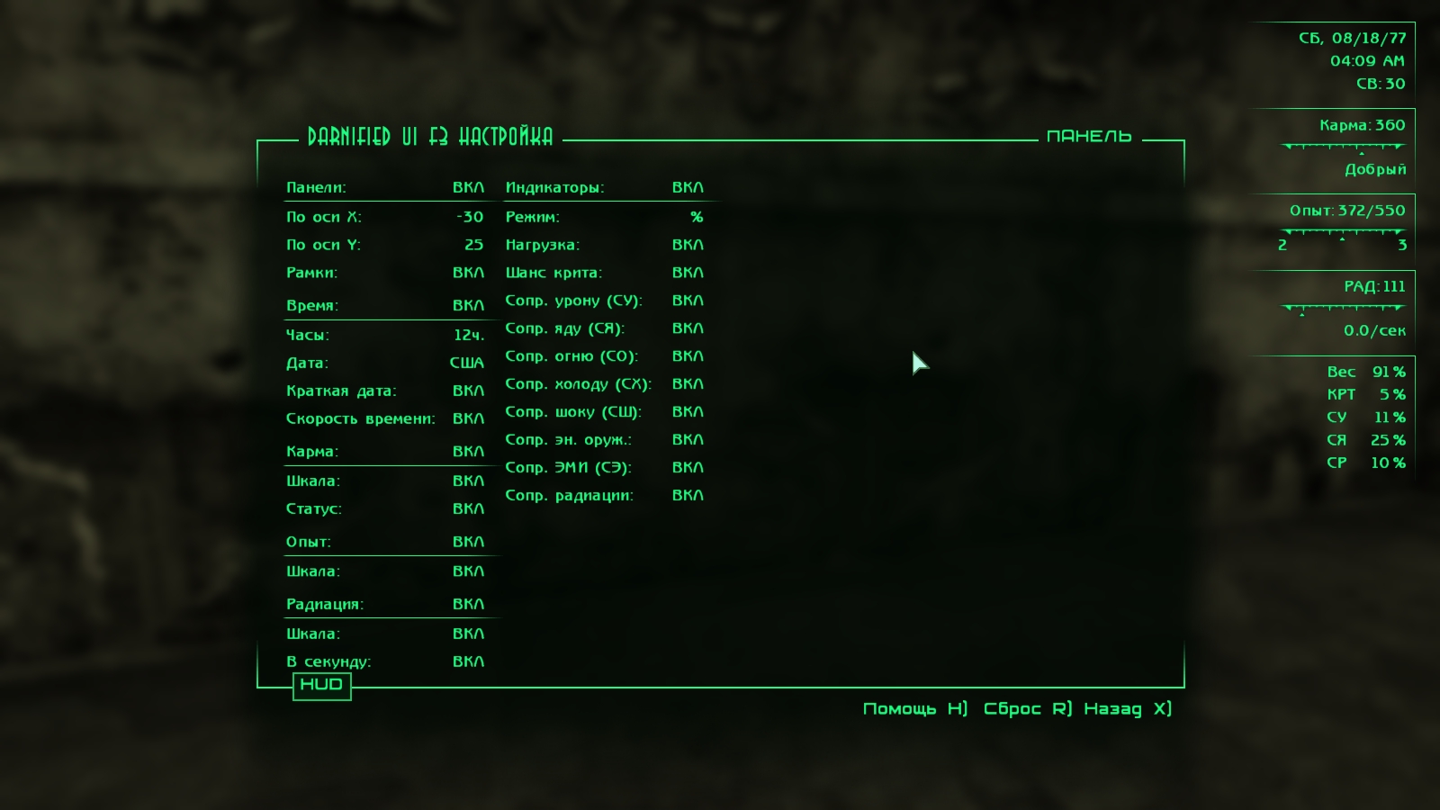 После запуска игры (с FOSE) в меню паузы появится кнопка DUI F3 - меню настройки DarNified UI. Воспользуйтесь кнопкой "помощь", если вам что-либо непонятно.