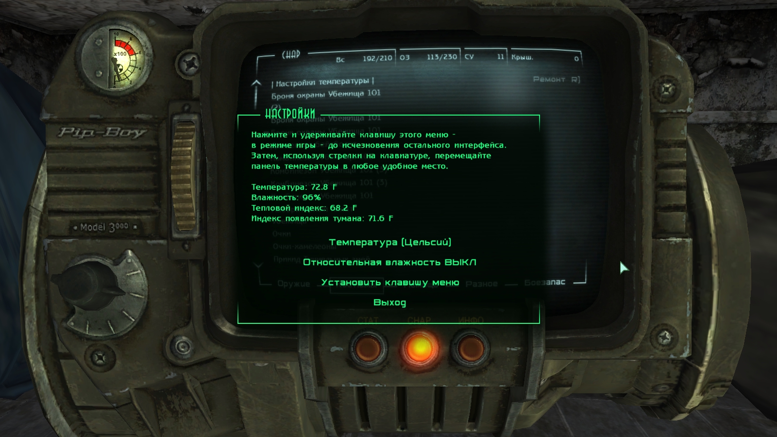 Просто счётчик температуры и относительной влажности окружающей среды (используется в геймплейных модах, в которых температура влияет на состояние вашего персонажа, и погодных модах, для расчёта появления тумана (из описания автора).