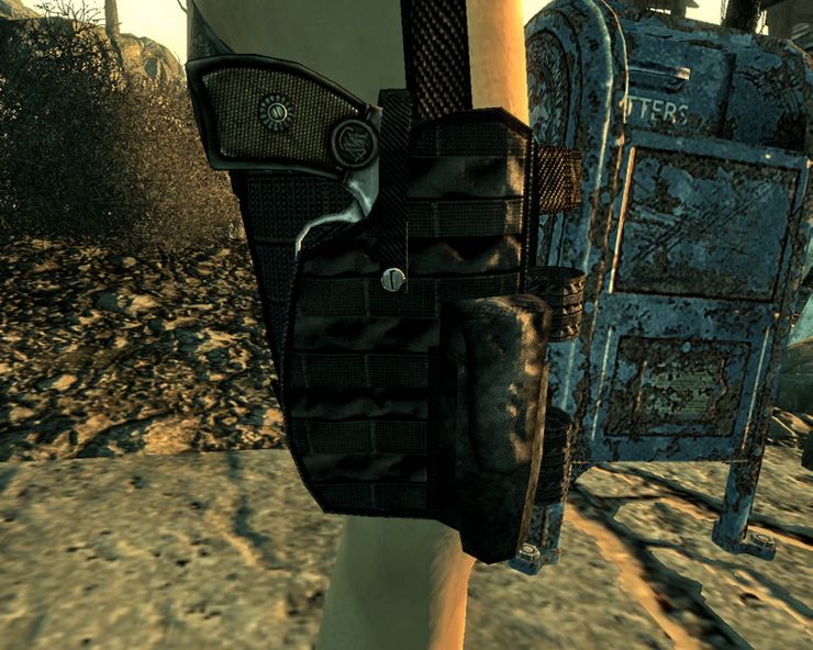 подобное оружие не будет висеть в воздухе около бедра, а будут находиться в набедренной кобуре. Сама кобура используется под слот одежды, поэтому её можно использовать для любых пистолетов - главное, чтобы модели оружия и кобуры "подходили" и не накладывались друг на друга. Найти все вы можете в почтовом ящике, в Спрингвейле. Смотрите скриншот, чтобы проще было найти вещи из плагина. В папке Optional Files лежит анимация экипирования оружия.