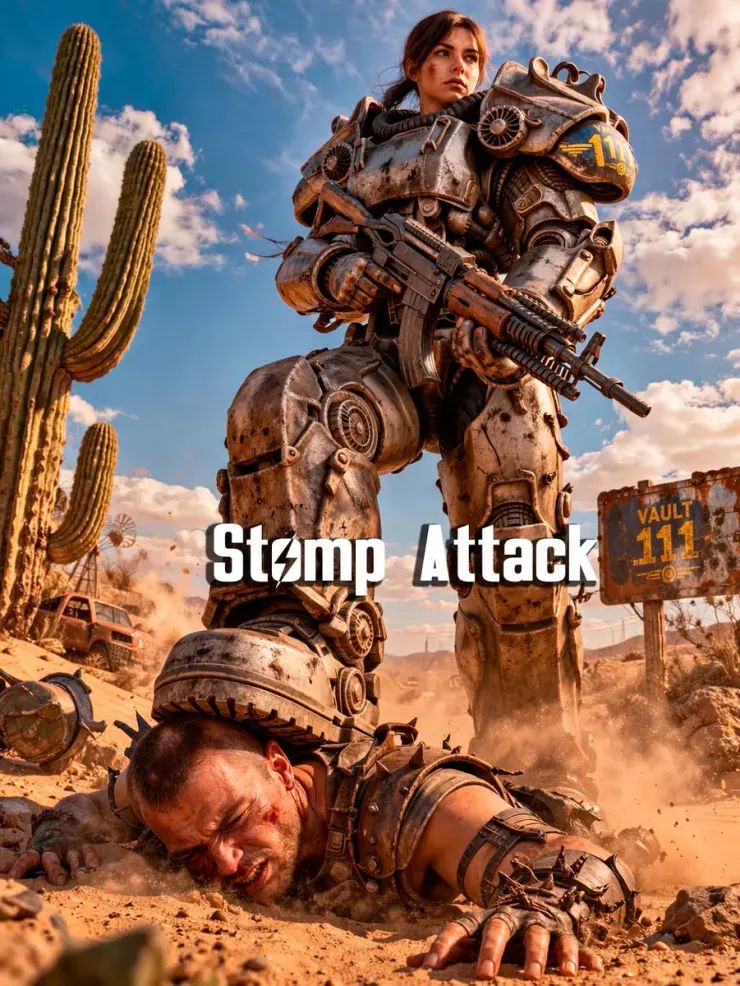 Базовый урон 150. Если правая нога брони цела еще +50. Если установлены "Взрывное отверстие T-60" еще +100 урона и эффект взрыва при ударе.