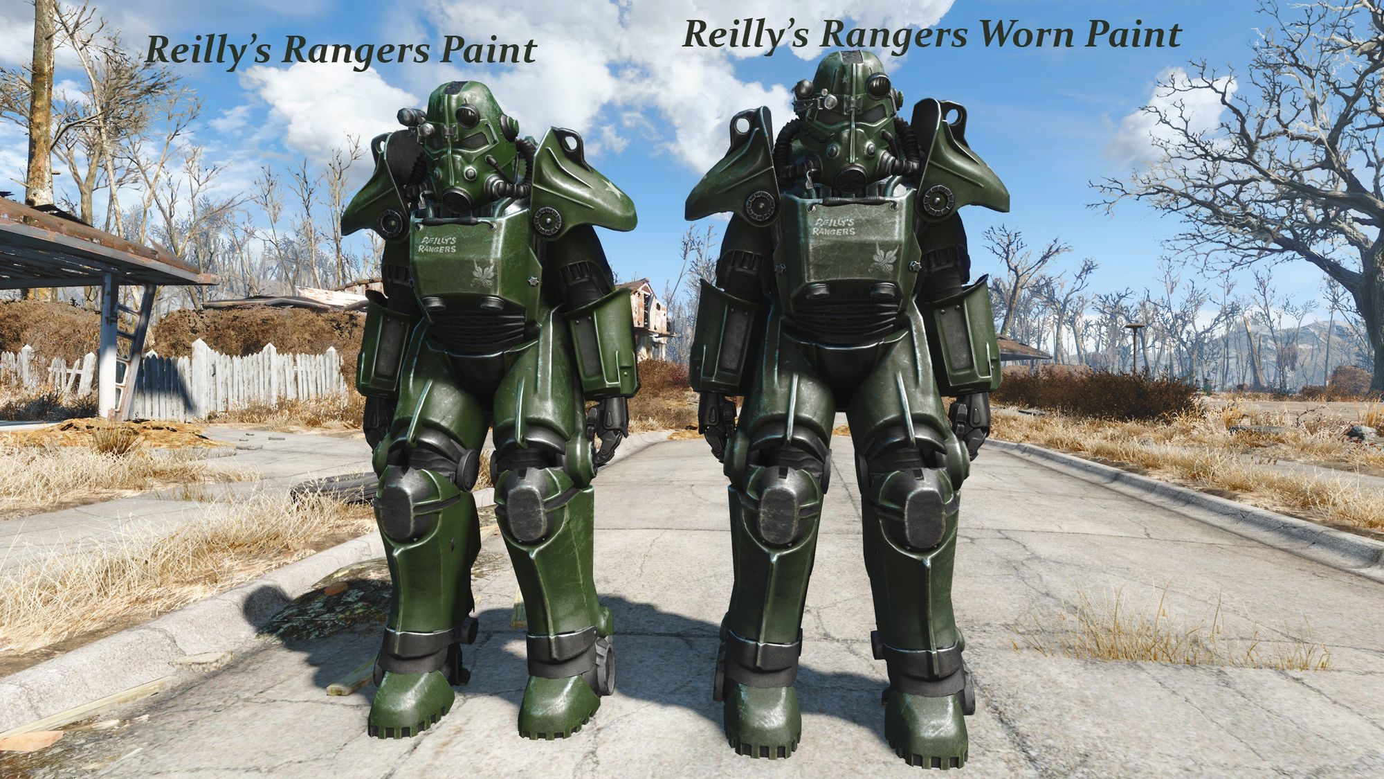 Добавляет в игру раскраску для силовой брони в стиле рейнджеров Рейли из Fallout 3. Доступны яркая и тусклая версии.