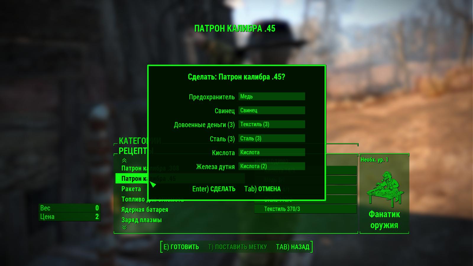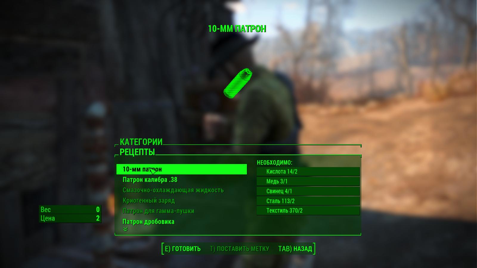 Учитывая возможности крафта в новом Fallout, где можно всячески модифицировать оружие и броню, создавать гранаты, мины, химические препараты и еду, странно видеть отсутствие возможности сделать обычные патроны. Данный мод исправляет этот недочет и добавляет в химическую лабораторию рецепты по созданию большинства типов боеприпасов из всевозможного хлама. Мод выполнен в четырех вариантах, позволяющих создавать по 10, 25, 50 и 100 патронов за один раз. Вам нужно выбрать только один вариант.