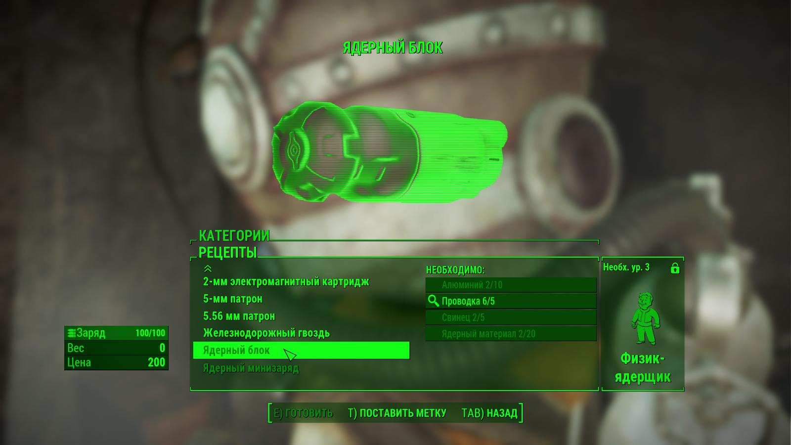 Простой плагин для любителей силовой брони. Дает возможность создавать ядерные блоки в химической лаборатории. Рецепт: 10 алюминия, 5 проводки, 5 свинца и 20 ядерного материала. Также требуется навык "Физик-ядерщик 3".
