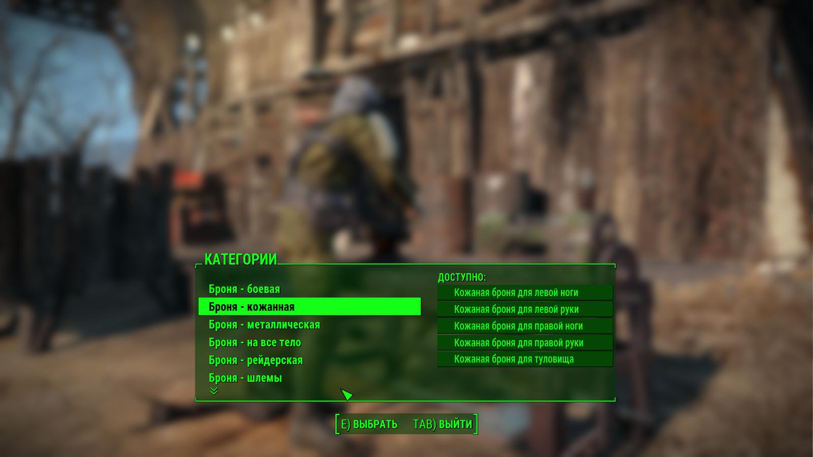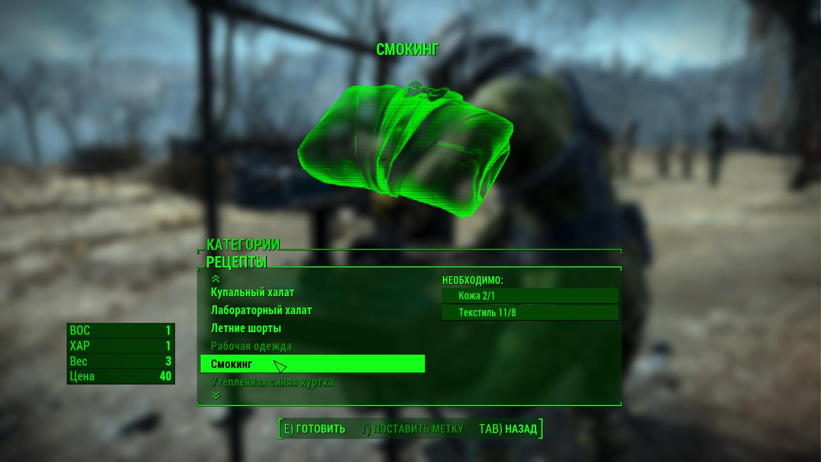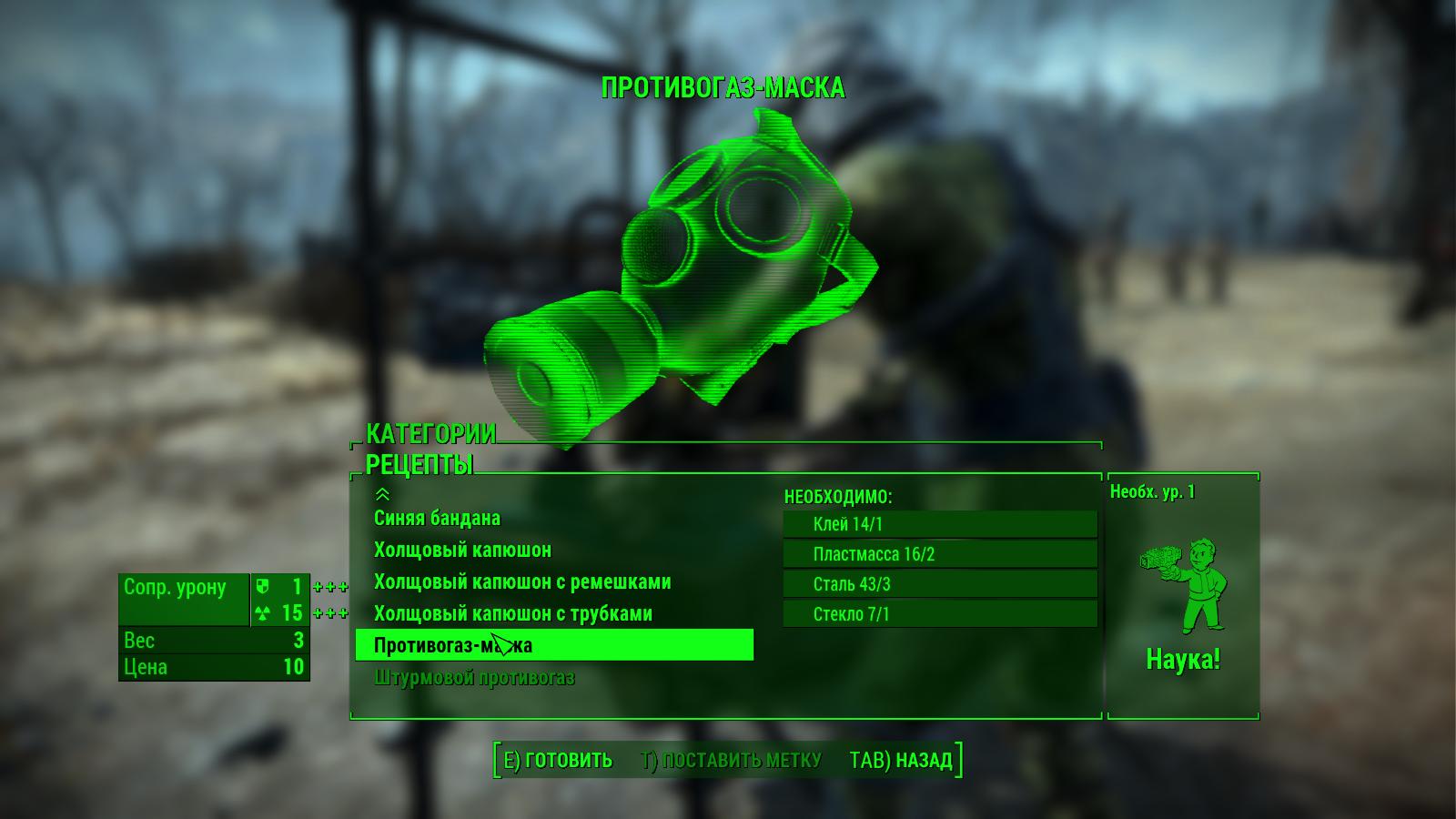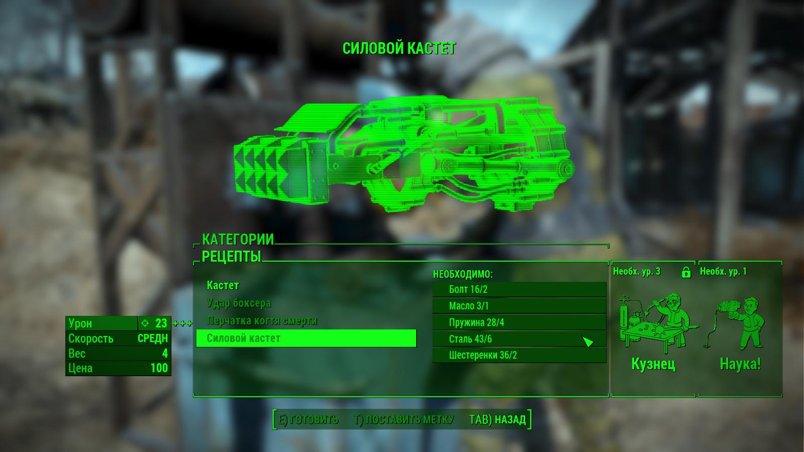 - Требование фракций и квестов. Добавляет требование для создания определенных предметов в виде выполнения квестов и вступления в одну из 4-х фракций: Минитмены, Подземка, Институт и Братство Стали. Если условия не выполнены, некоторые предметы не будут доступны для создания в меню верстака.