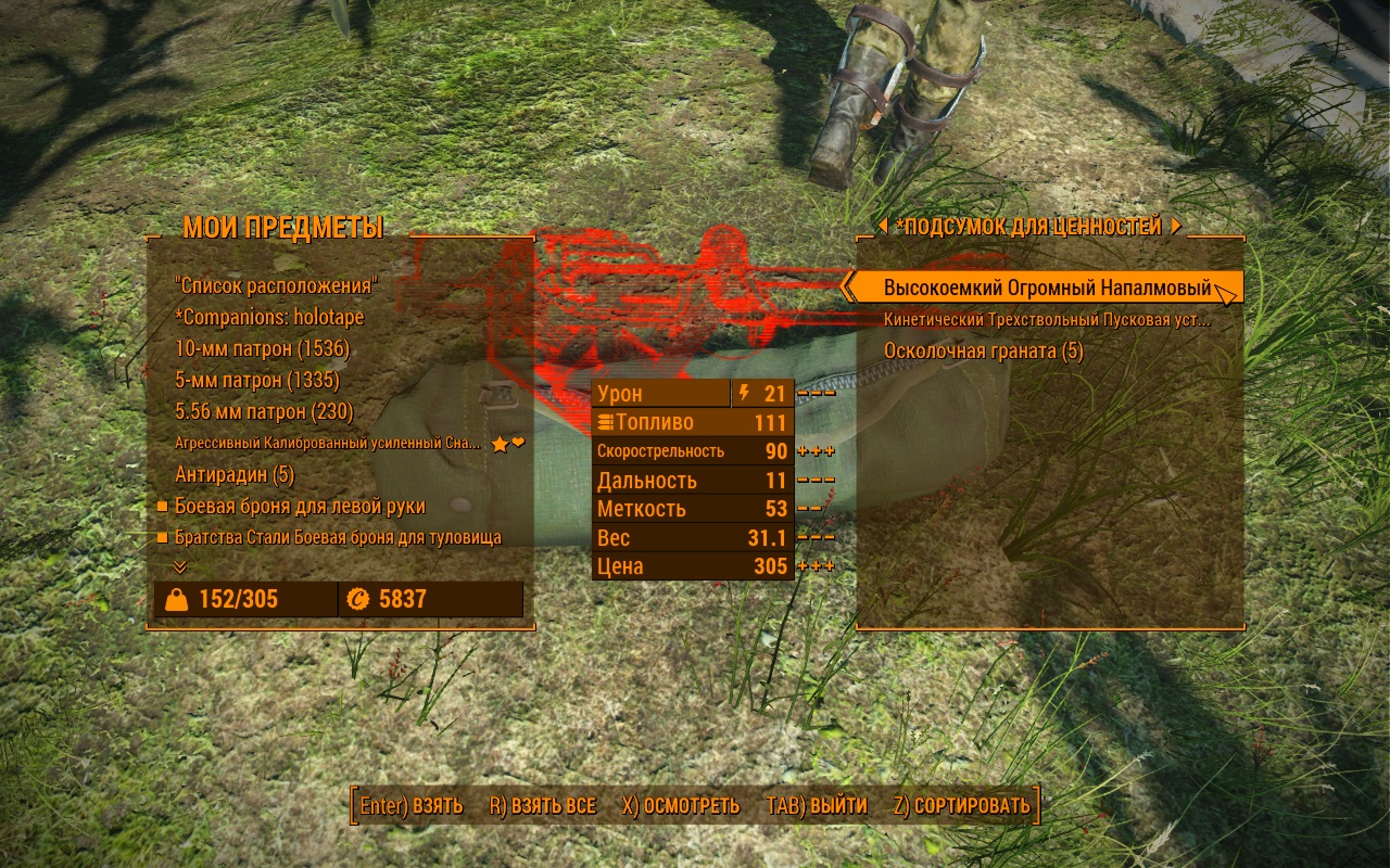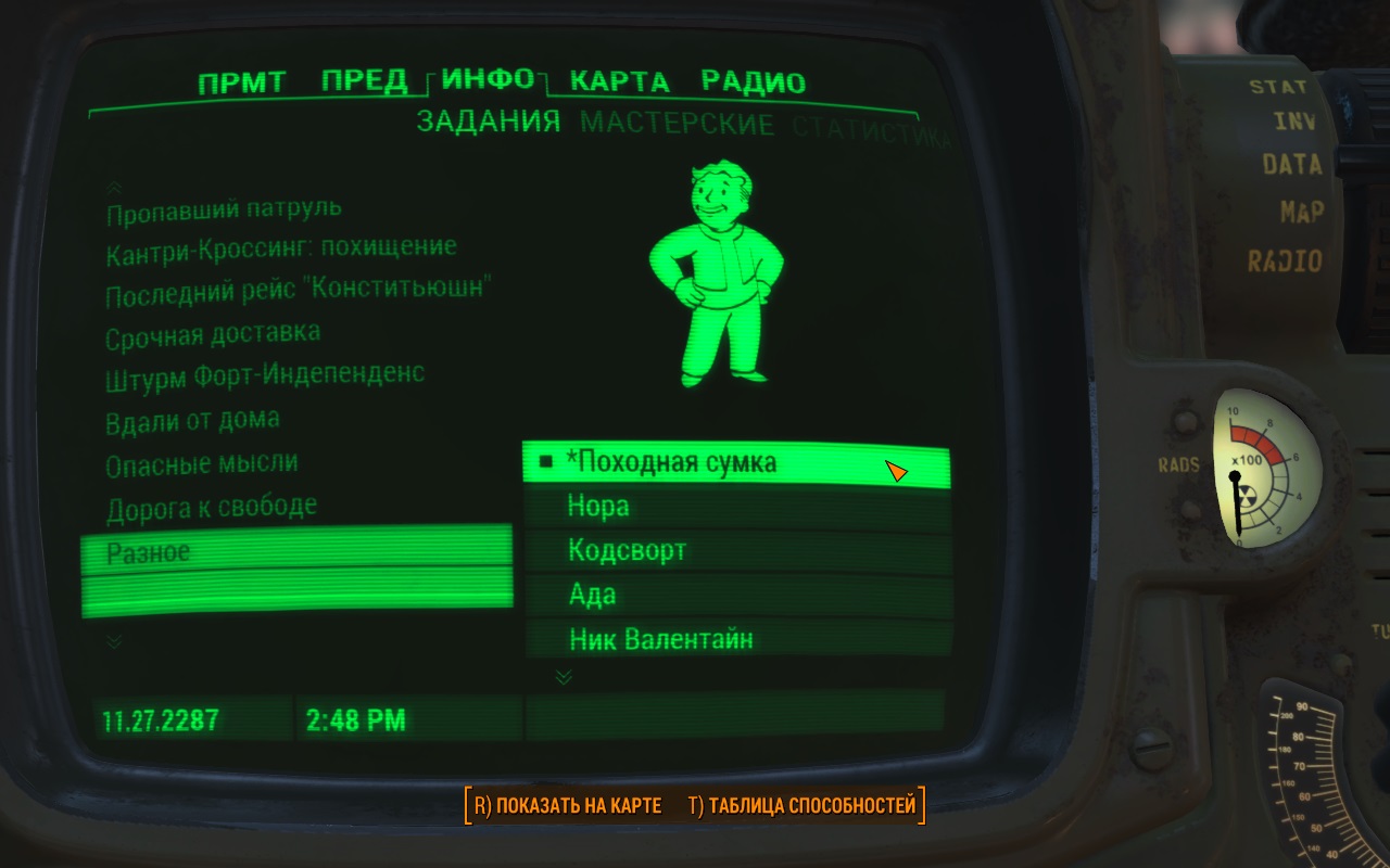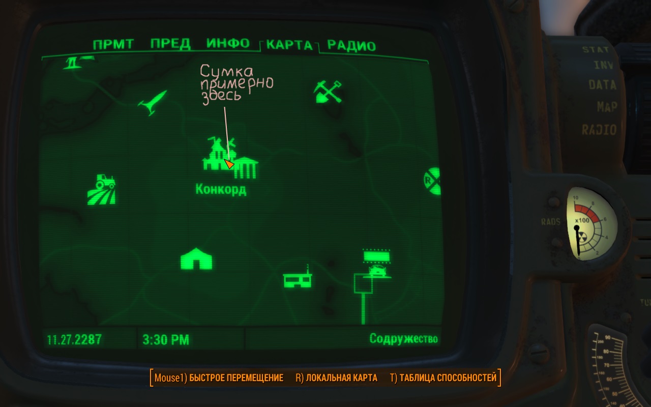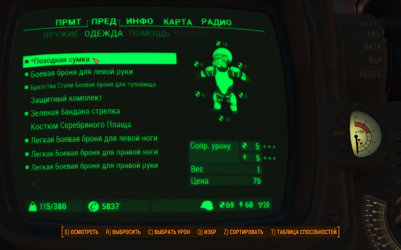При выборе первых двух пунктов открываются равнозначные независимые контейнеры без ограничения количества и массы груза, третий пункт – сумка помещается в инвентарь и автоматически экипируется. Чтобы вновь воспользоваться сумкой, ее необходимо выложить из инвентаря на землю, по умолчанию клавишей «R». Выложенная на землю отмечена маркером на карте. Также появляется маркер с именем контейнера или НПС, если сложить сумку в не самодельный контейнер, передать кому-либо из НПС, или НПС ее украдет. Поэтому потерять ее практически невозможно. Можно пометить компаньона, передав ему сумку. Экипированная не замещает никакое снаряжение (это не относится к опциональному плагину, см. ниже Работа над ошибками). В силовой броне тоже работает.