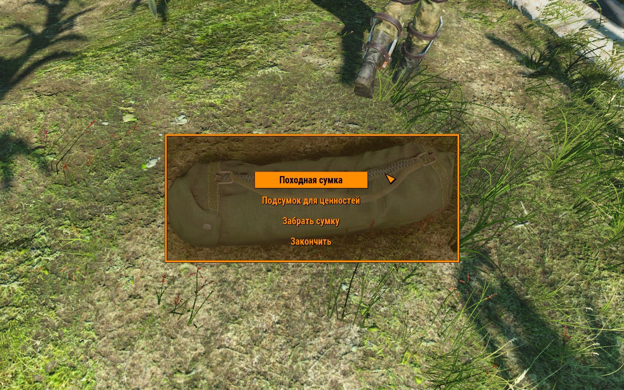 Походная сумка находится в интерьере «Мануфактура» в Конкорде. Сумка позволяет переносить неограниченное количество собранных вещей. Лежащая на земле сумка активируется обычным методом – нажатием клавиши «Е», при этом выводится ме-ню выбором действий: