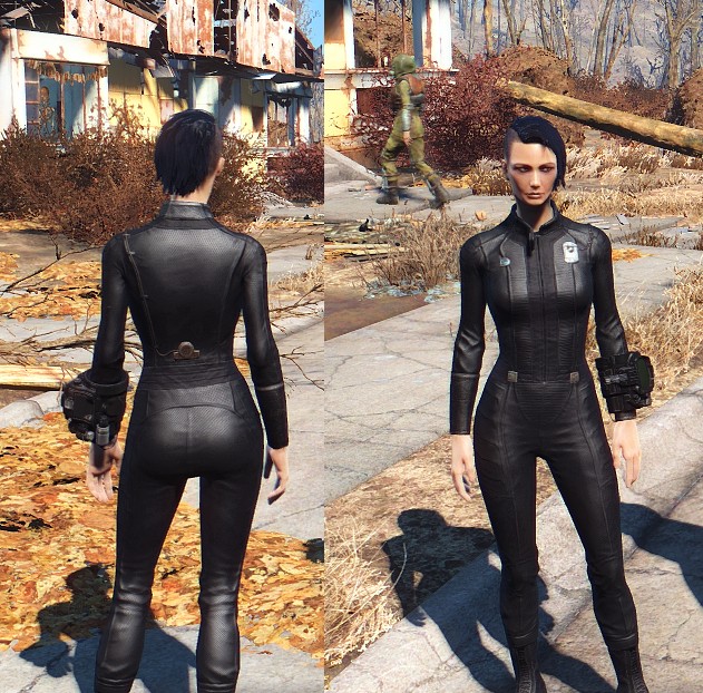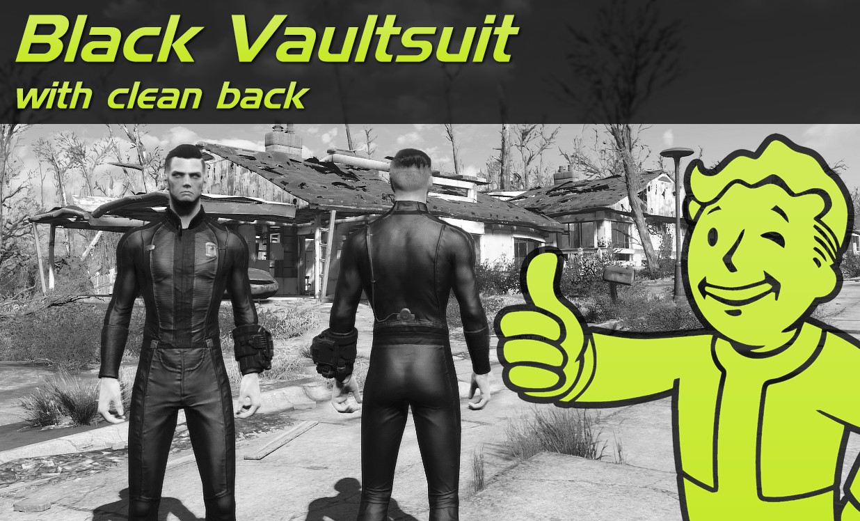 Меняет цвет комбинезона жителя убежища на черный, убирает номер убежища со спины, но доступен доп. файл на возвращение номера убежища на спину, если он вам дорог.