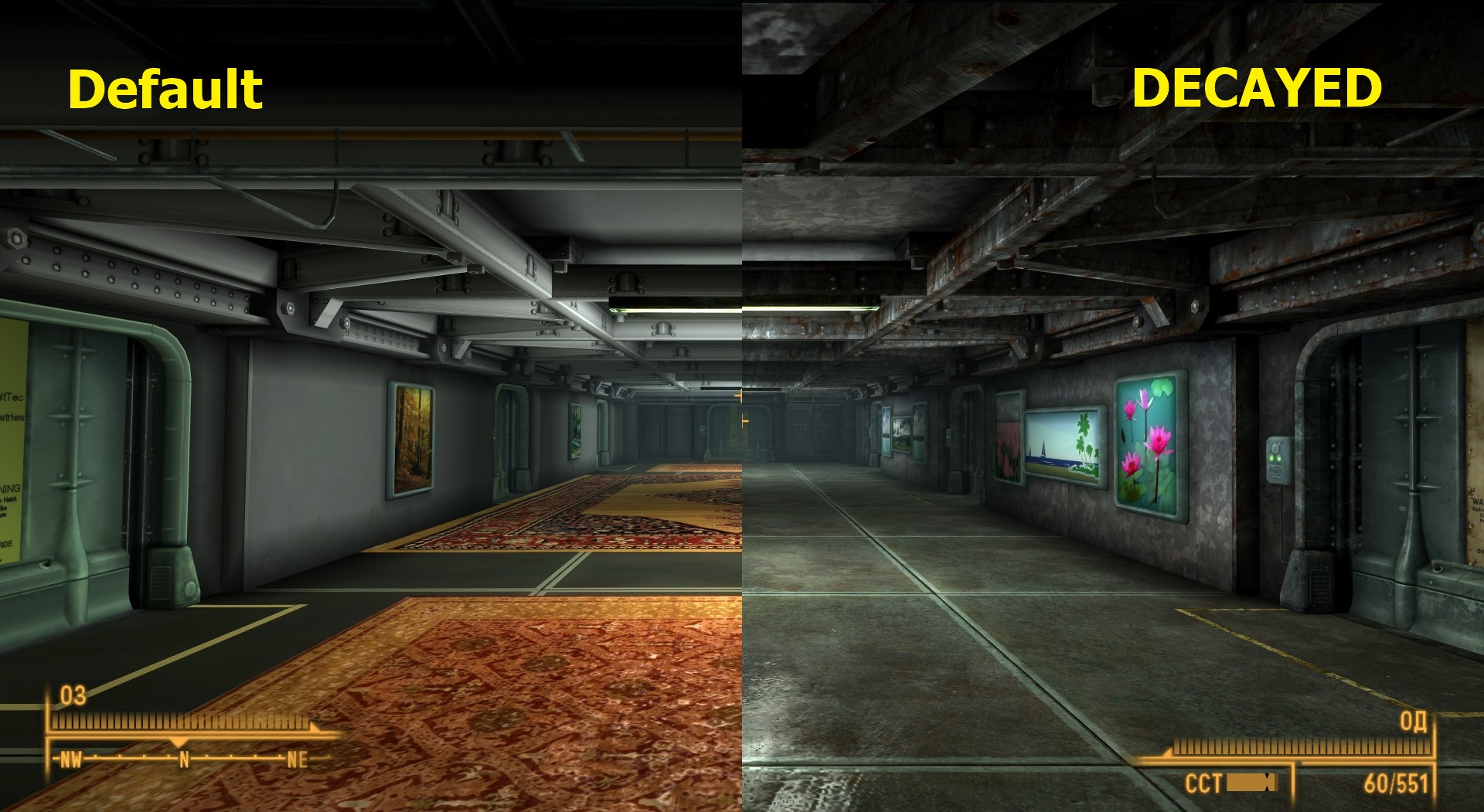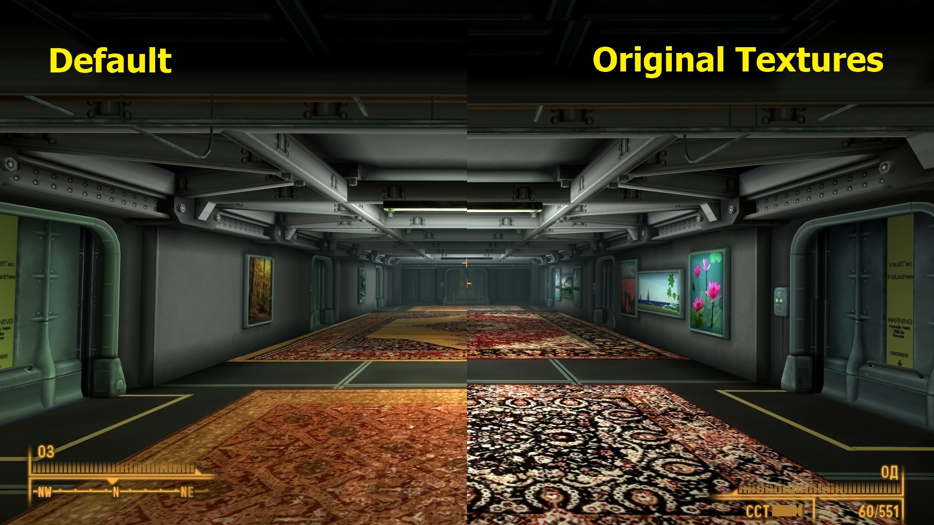 При необходимости можно установить текстуры из версии мода для Fallout 3. Для этого после установки основного мода скопировать папку textures из папки OrigTextures архива с модом в папку Data игры с заменой файла (только для основной версии мода для Fallout: New Vegas).
