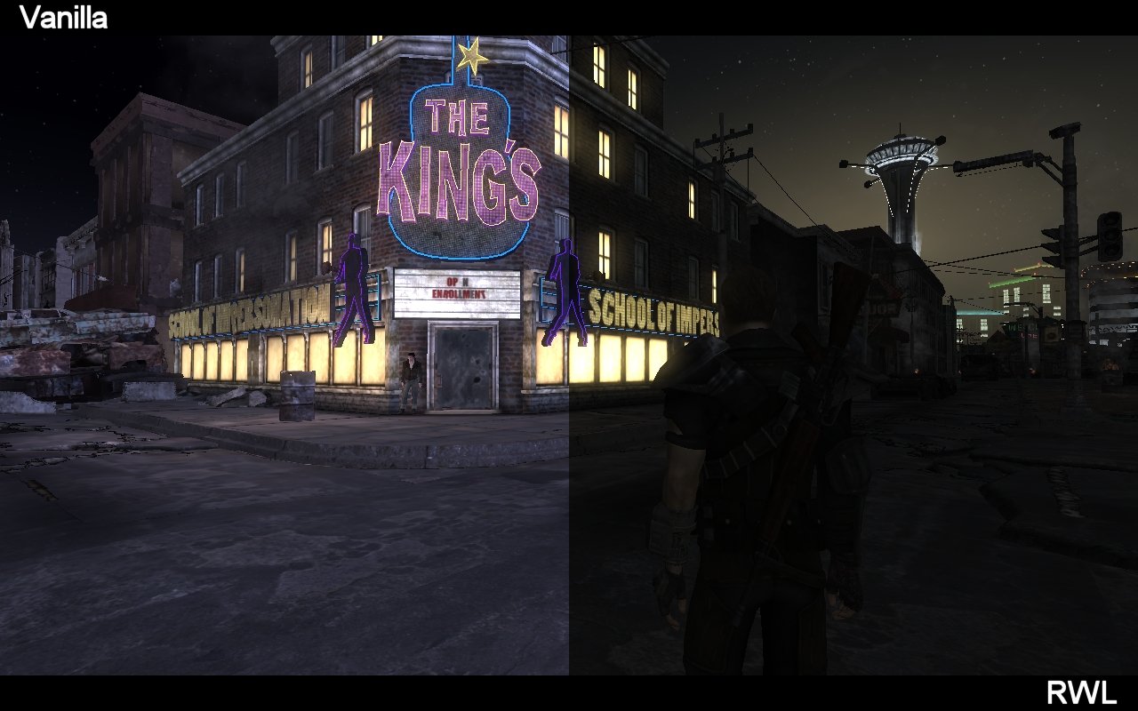 Данный мод совместим с модом "Ночи Мохаве – реплейсер луны и звёзд" (Mojave Nights - a moon and stars replacer), но он (этот мод - Реалистичное освещение на Пустоши) должен быть установлен после мода Ночи Мохаве.