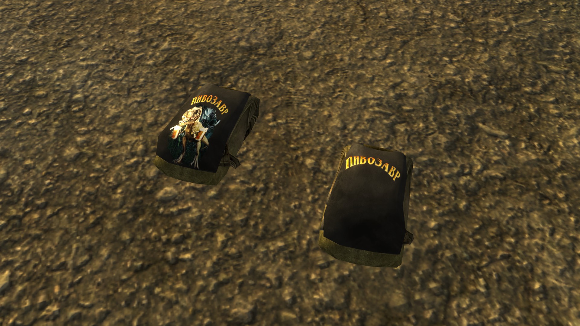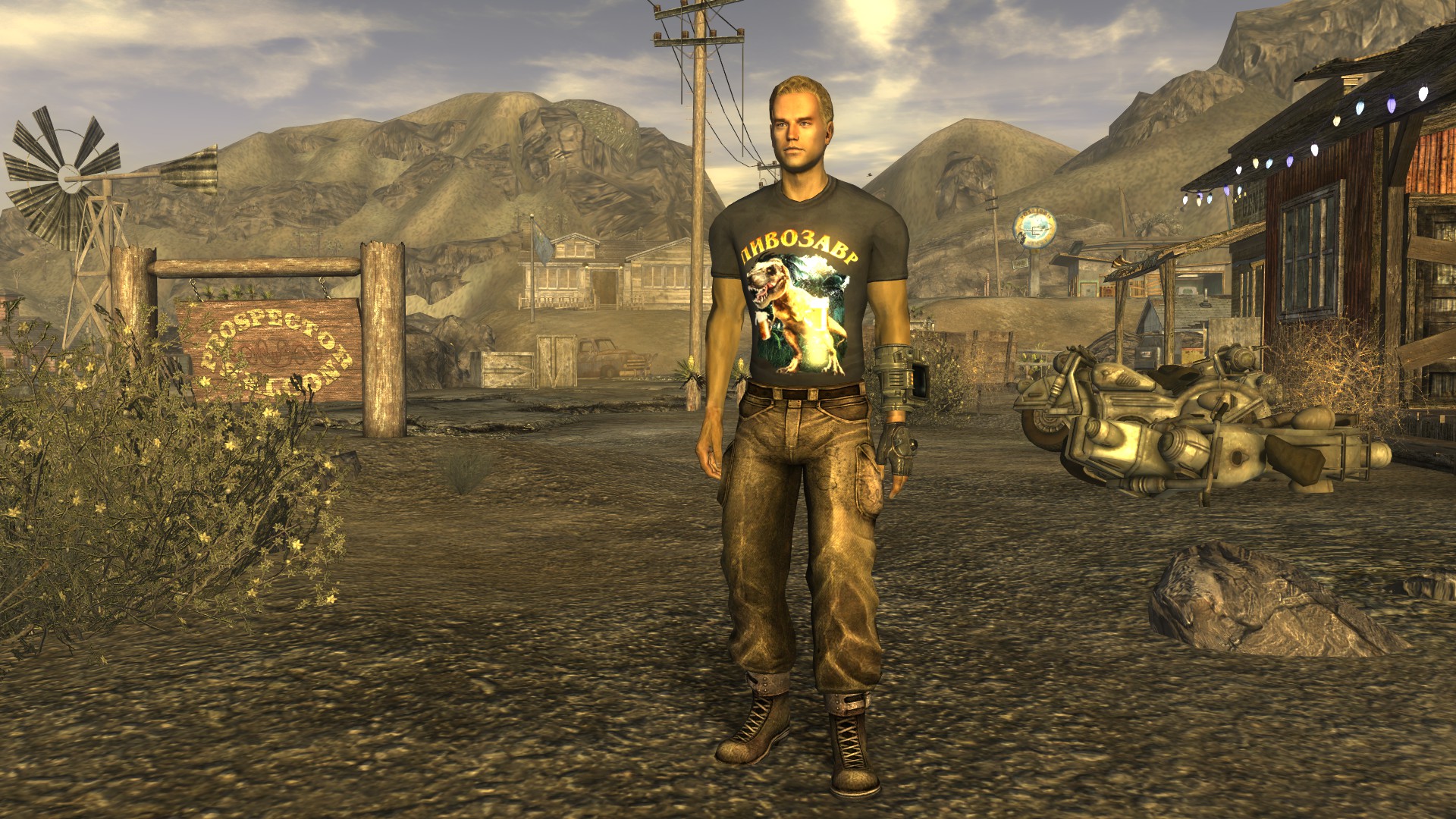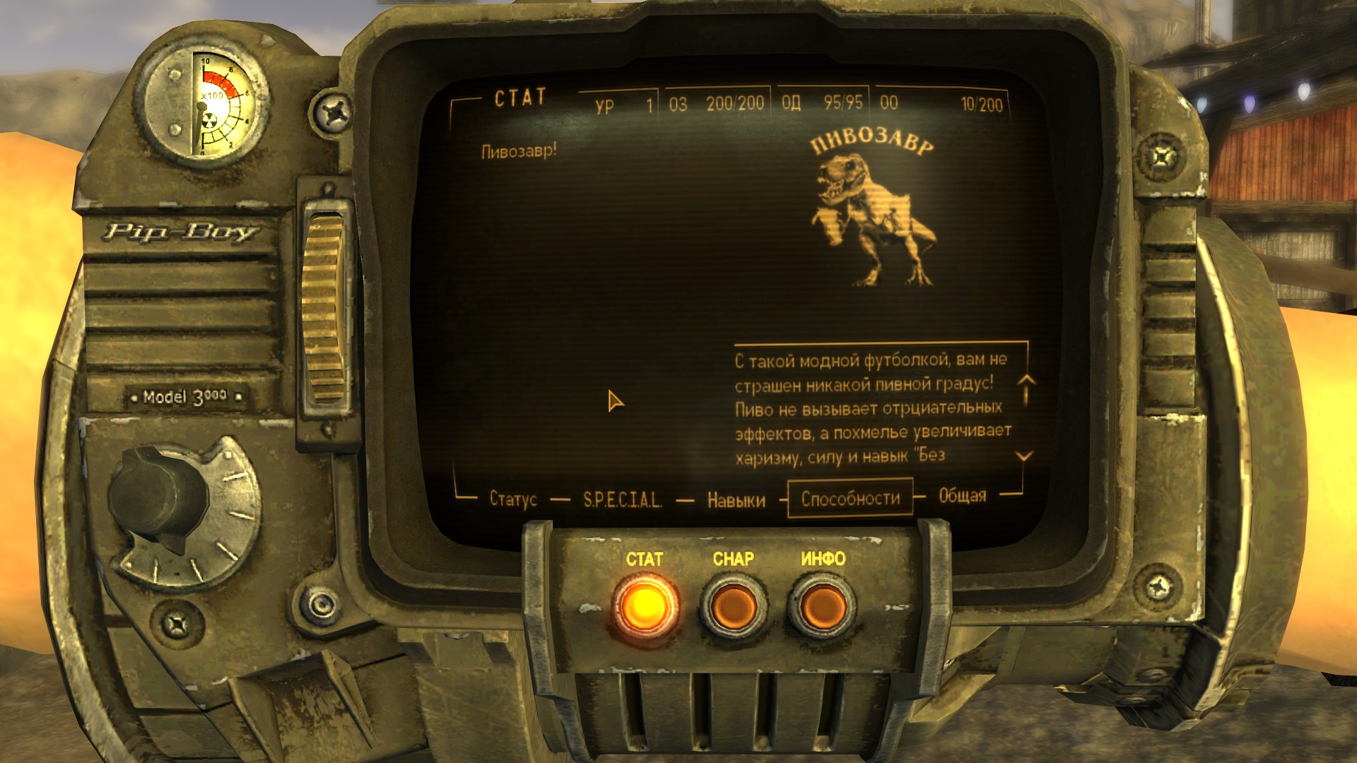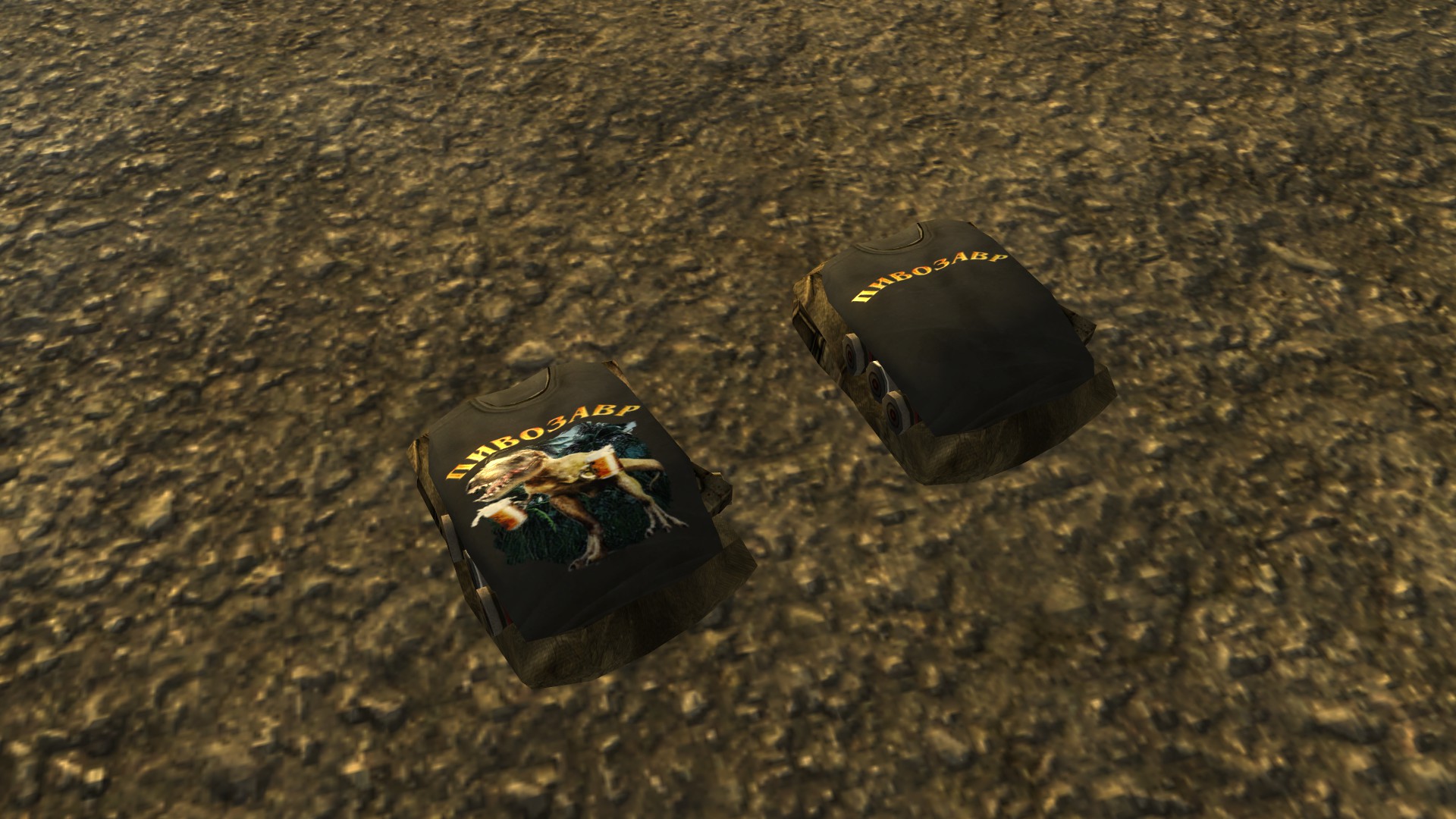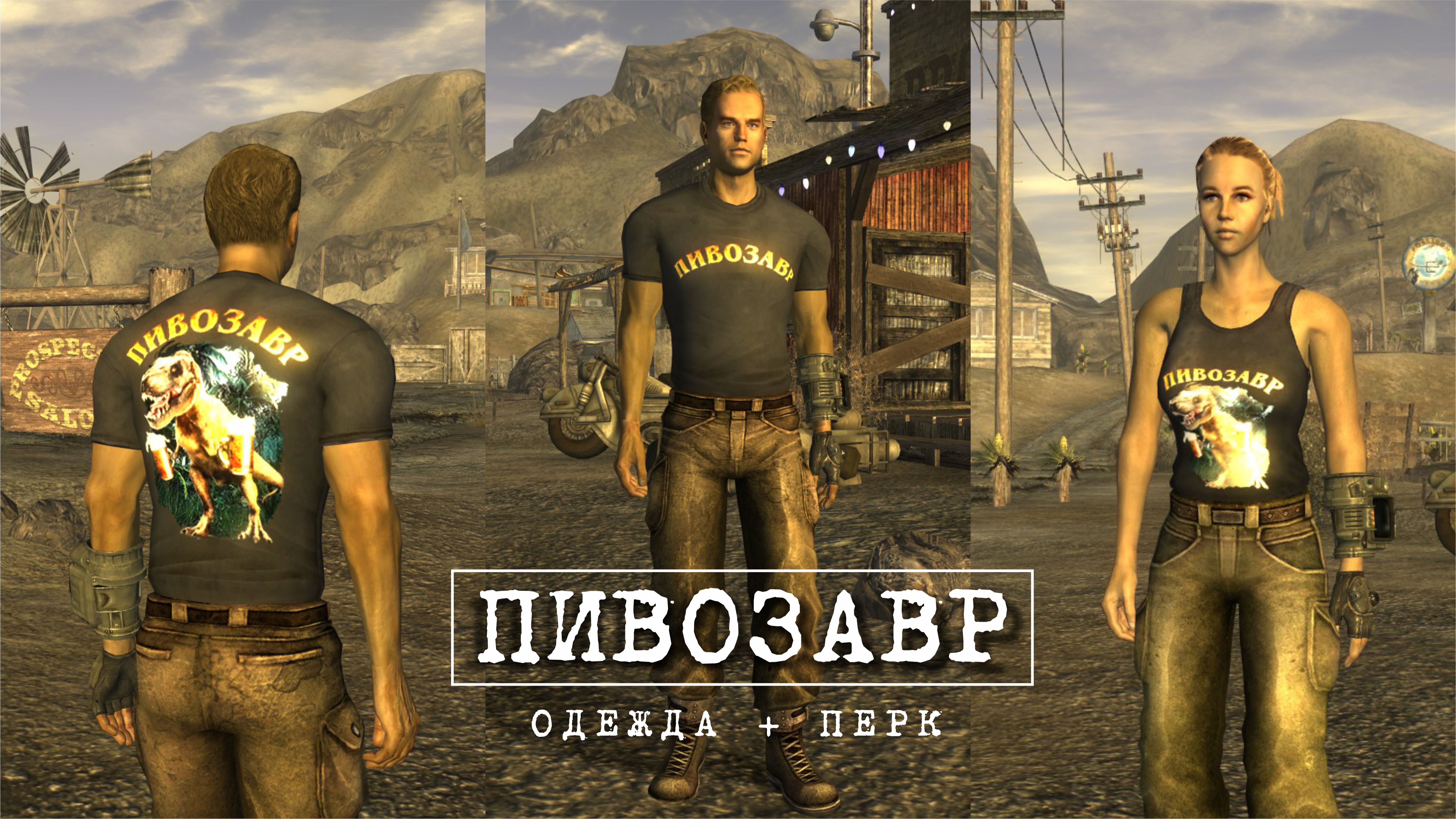 Модная футболка для мужского персонажа (или майка для женского) снижающая интеллект на одно очко, но назначающая необычный перк "Пивозавр!". Текстура футболки имеет собственную нормаль на логотип, поэтому пивозавр отражает свет. Пока одежда на вас, употребление пива (включая радиоактивное) не вызывает отрицательных эффектов (обезвоживание тоже не повышается). При наступление похмелья у героя увеличивается харизма, сила и навык без оружия минимум на +10 очков, тем самым нет нужды продолжать пить пиво для поддержания положительного эффекта. Похмелье полностью покрывает эффект от пива и дает прибавку к навыку без оружия.