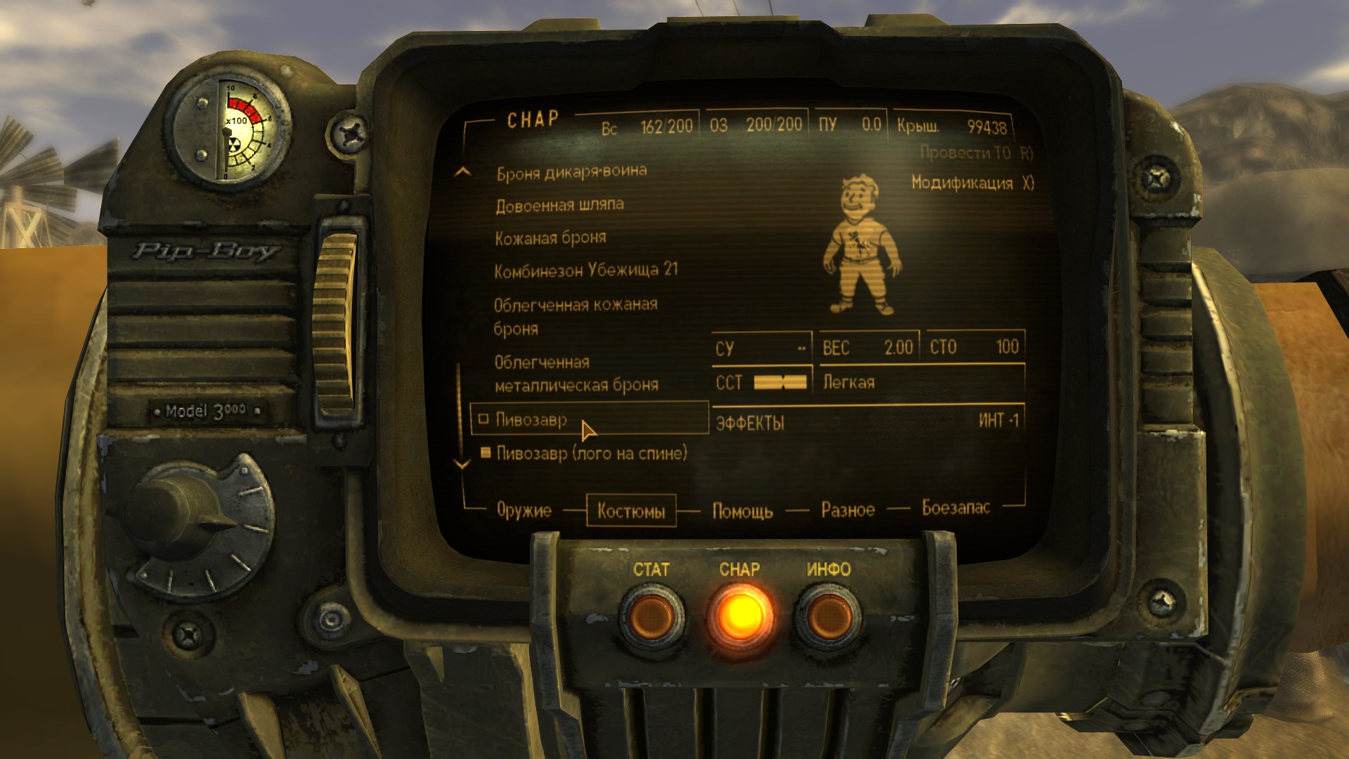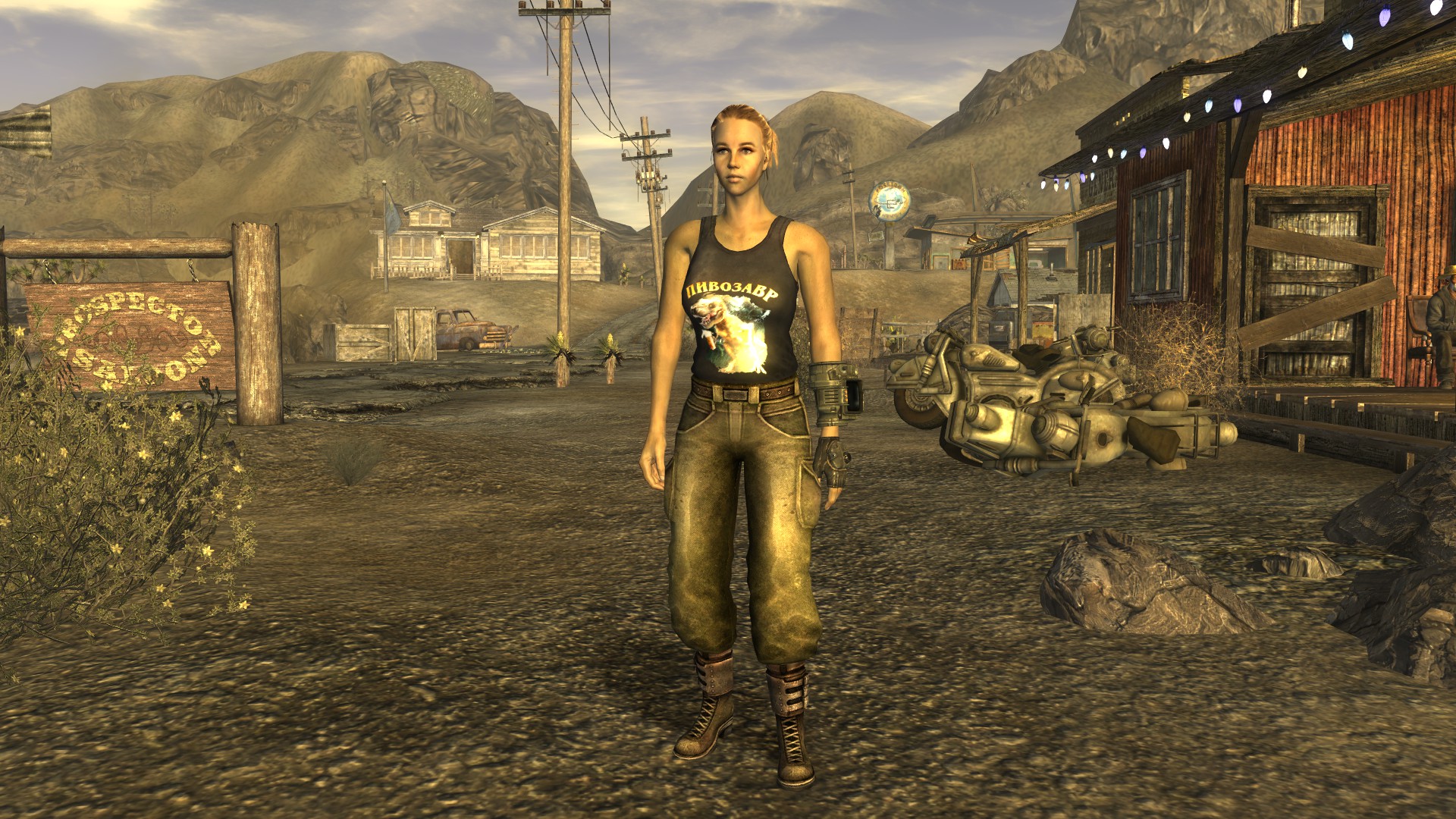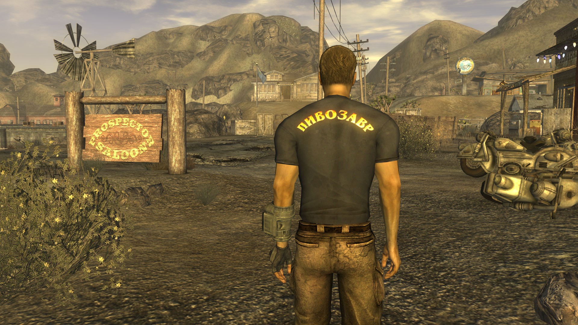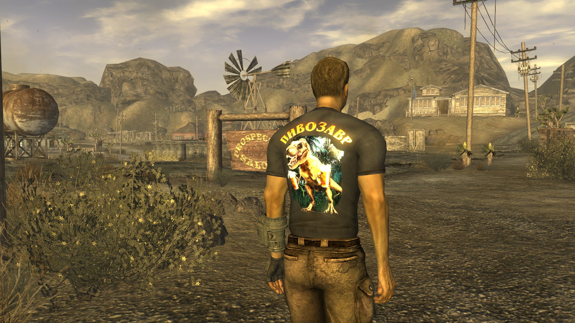 Модная футболка для мужского персонажа (или майка для женского) снижающая интеллект на одно очко, но назначающая необычный перк "Пивозавр!". Текстура футболки имеет собственную нормаль на логотип, поэтому пивозавр отражает свет. Пока одежда на вас, употребление пива (включая радиоактивное) не вызывает отрицательных эффектов (обезвоживание тоже не повышается). При наступление похмелья у героя увеличивается харизма, сила и навык без оружия минимум на +10 очков, тем самым нет нужды продолжать пить пиво для поддержания положительного эффекта. Похмелье полностью покрывает эффект от пива и дает прибавку к навыку без оружия.