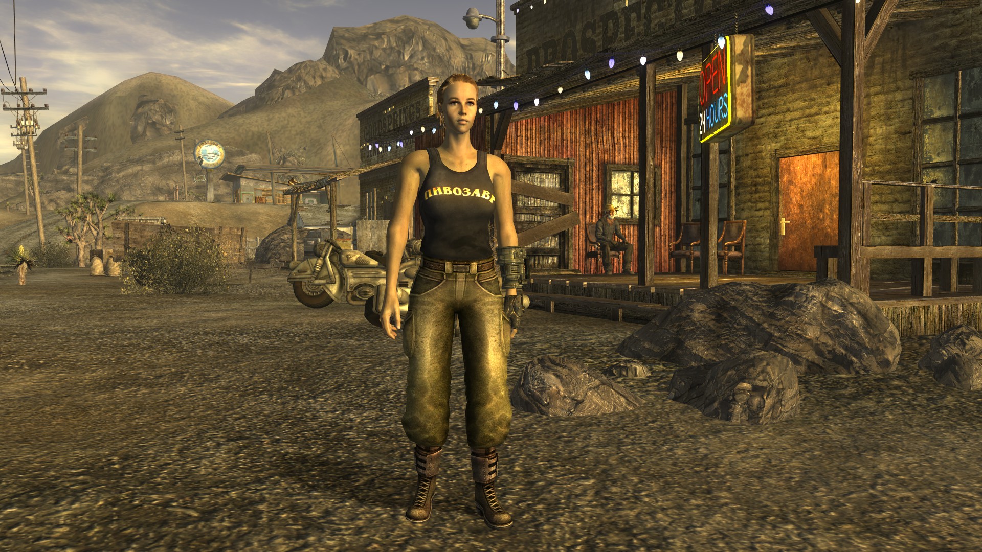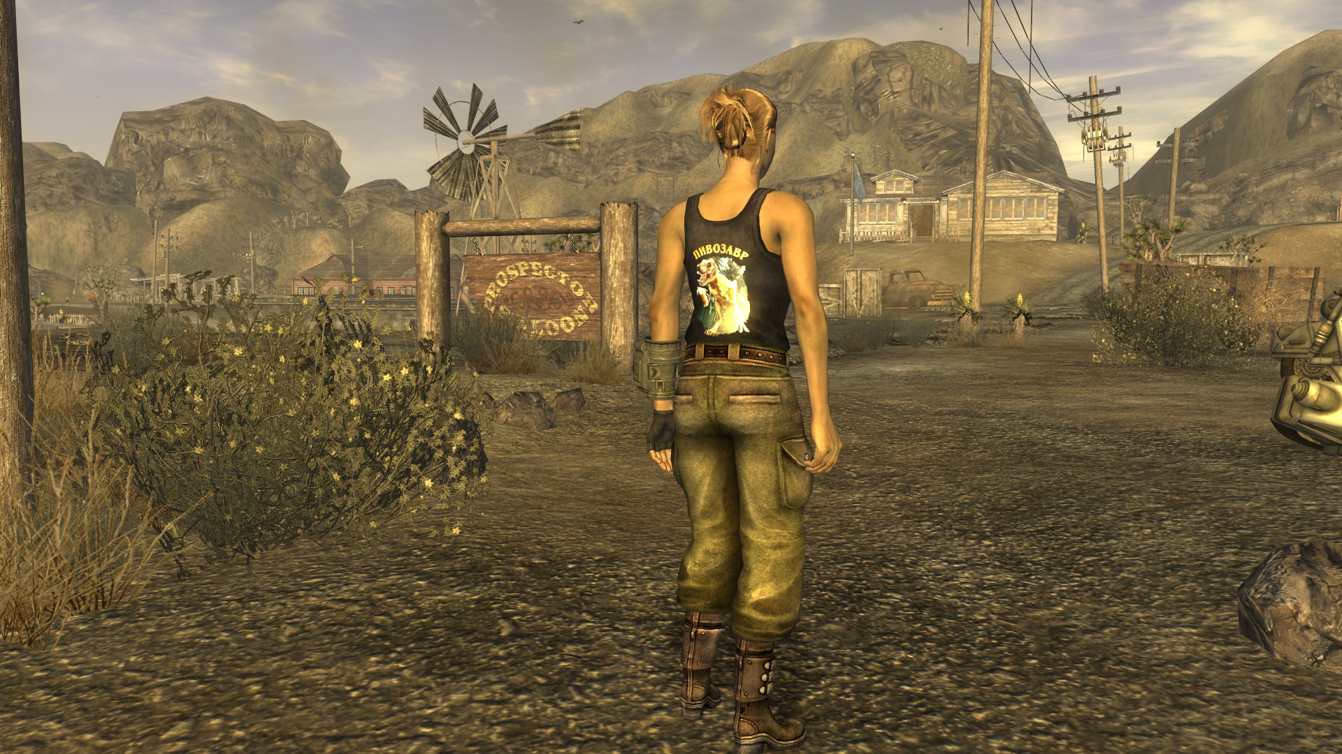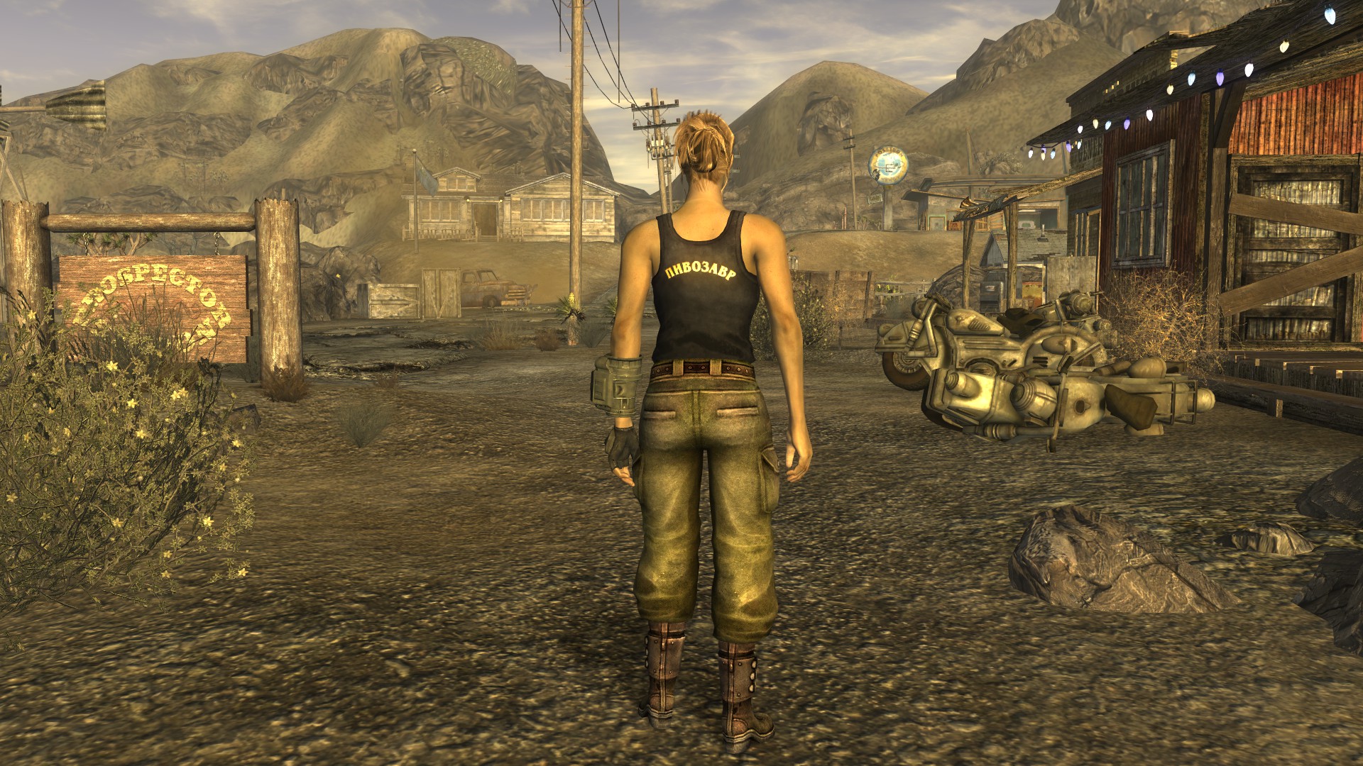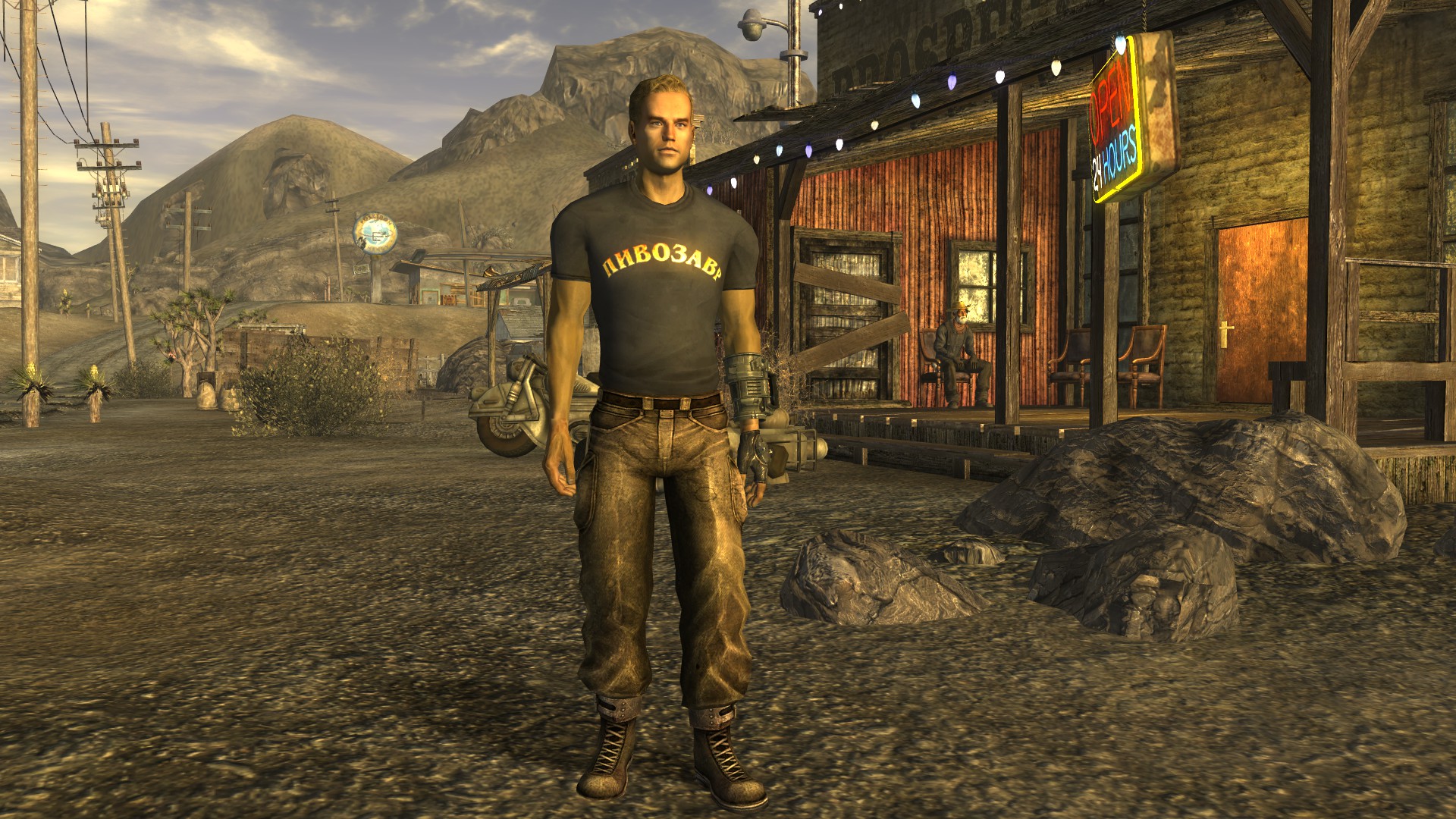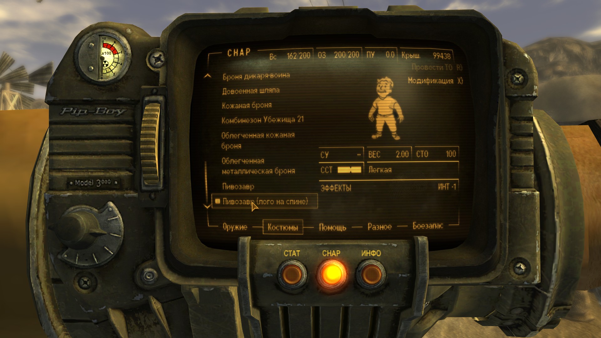Модная футболка для мужского персонажа (или майка для женского) снижающая интеллект на одно очко, но назначающая необычный перк "Пивозавр!". Текстура футболки имеет собственную нормаль на логотип, поэтому пивозавр отражает свет. Пока одежда на вас, употребление пива (включая радиоактивное) не вызывает отрицательных эффектов (обезвоживание тоже не повышается). При наступление похмелья у героя увеличивается харизма, сила и навык без оружия минимум на +10 очков, тем самым нет нужды продолжать пить пиво для поддержания положительного эффекта. Похмелье полностью покрывает эффект от пива и дает прибавку к навыку без оружия.