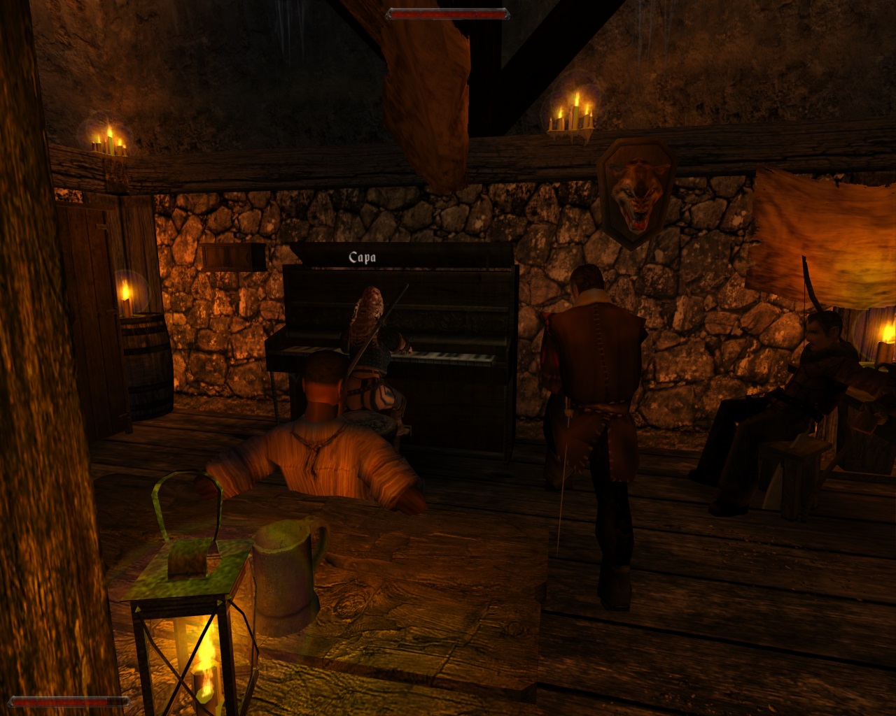 - Сара играет в местной таверне на пианино вечерами и выглядит классно