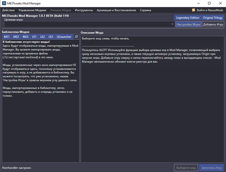 ME3Tweaks Mod Manager — это менеджер модов, который поддерживает игры как стандартной трилогии Mass Effect, так и все три легендарные версии игр. У менеджера есть встроенный русский интерфейс.