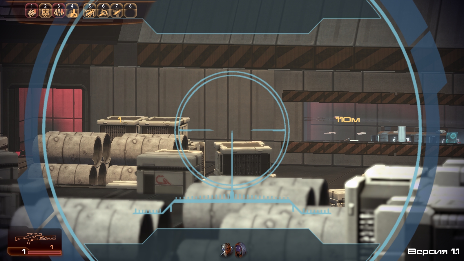Сам прицел нарисован вручную по скриншоту с первого ME и следовательно не полностью ему идентичен. Прицел кое-где смазан, это из-за не самого хорошего способа использования текстуры прицела в ME2. Он просто растягивает квадратную текстуру на весь монитор.