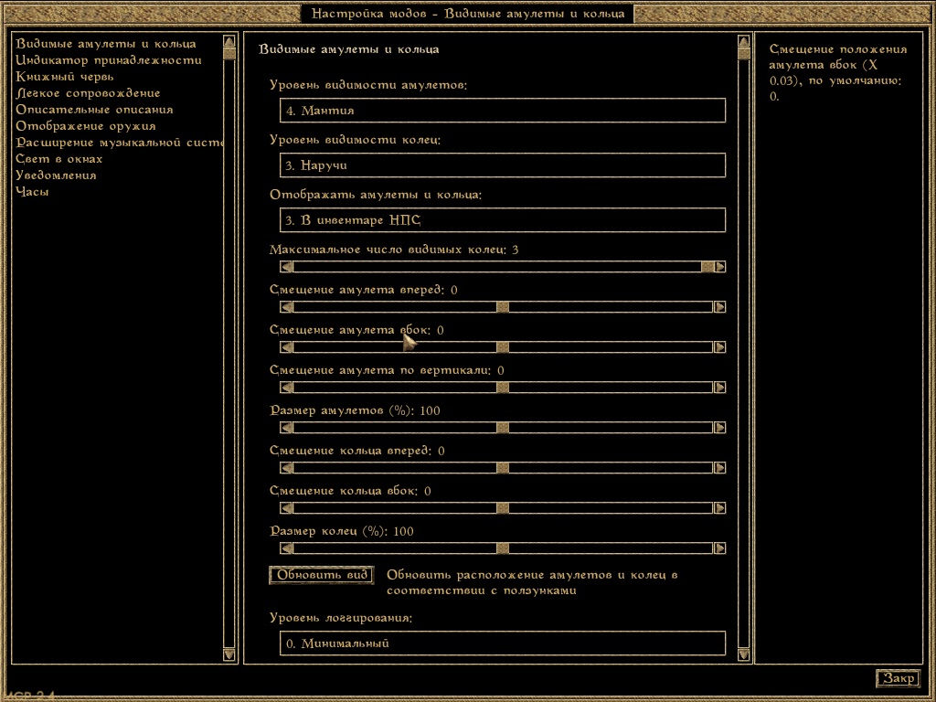 Опция по умолчанию «3. В инвентаре НПС» будет отображать экипированные / находящиеся в инвентаре амулеты и кольца на НПС любой играбельной расы. «0. Отключено» - в основном, для временного отключения модовых эффектов. Отключение «2. На НПС» или «3. В инвентаре НПС» скорее всего обновит отображение амулетов и колец на загруженных в данный момент НПС при следующей загрузке ячейки. Только надетые амулет и кольца будут видны на игроке (иначе будет сложно понять, какие предметы вы экипировали), в то время как НПС могут показывать также не надетые амулеты и кольца. Это потому, что НПС могут не всегда экипировать предметы, а предметы, экипированные НПС, более недоступны из их инвентаря / меню торговли, так что лучше смириться с тем, как игра / другие моды экипируют их.